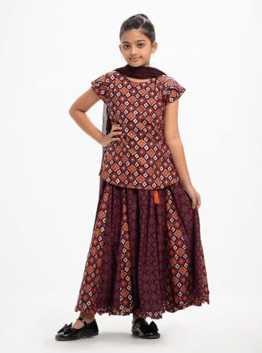 Round-neck ghagra-choli set in viscose fabric. Butterfly-sleeved peplum top with embroidery at the front. Complemented with a godet skirt and a tie-dye chiffon dupatta.