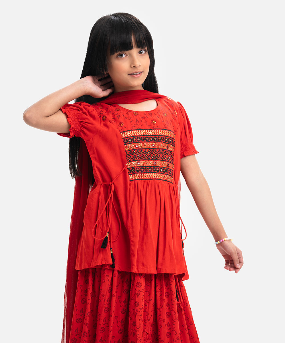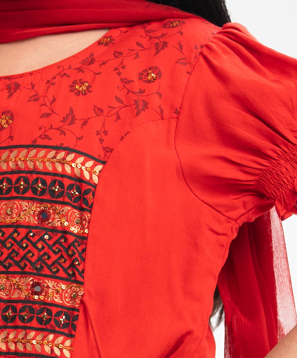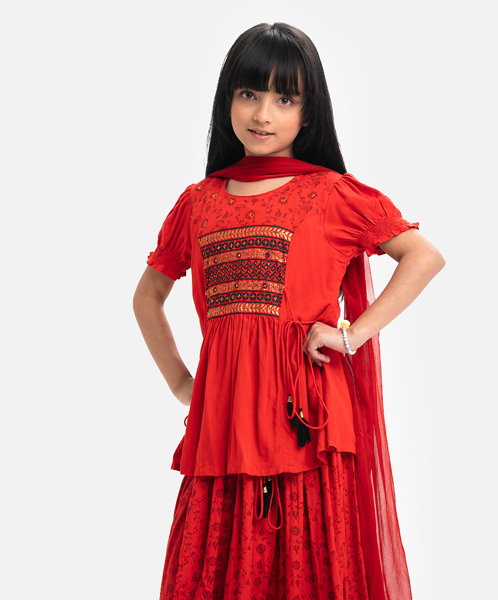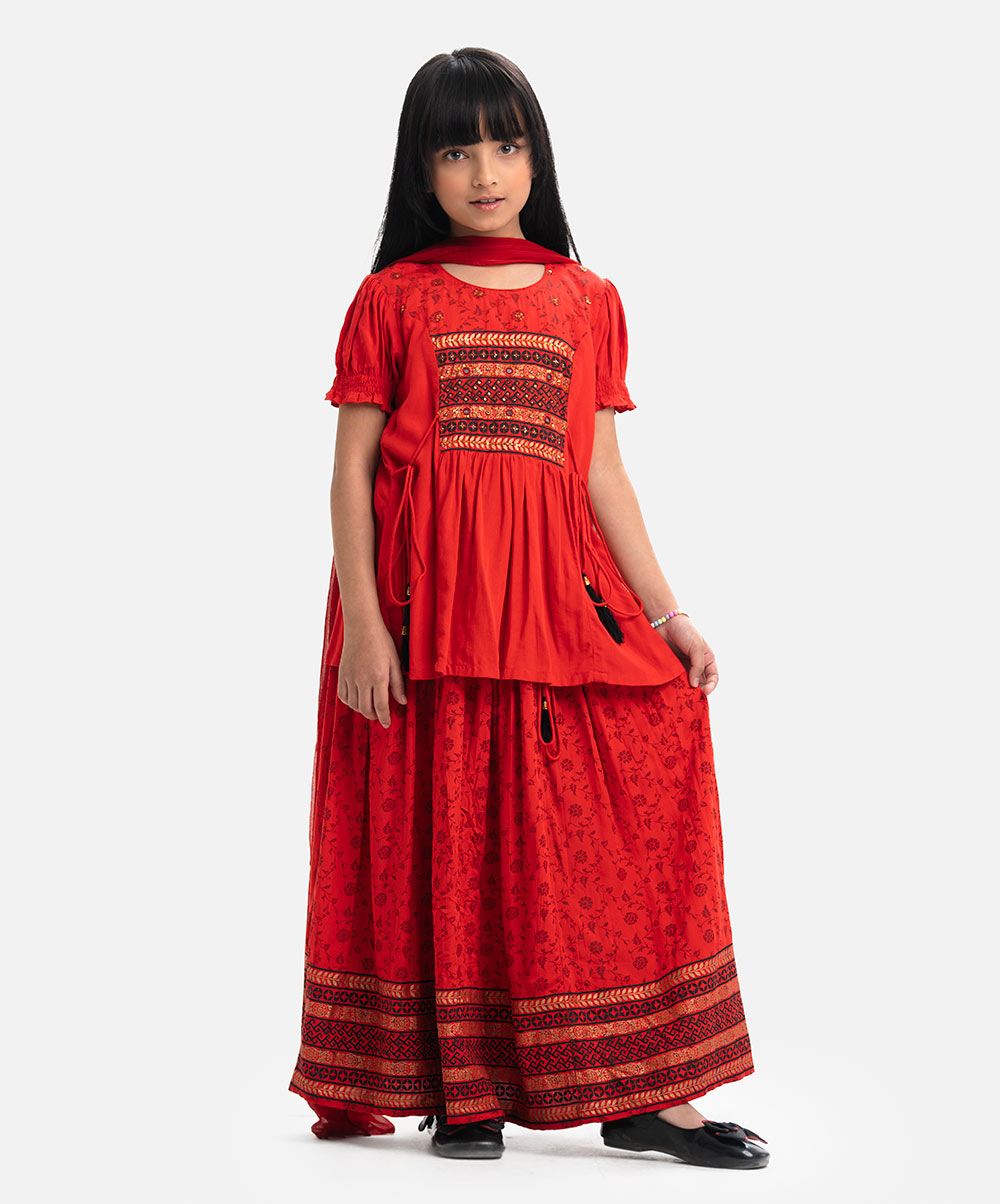 Round neck princess patterned ghagra choli set in viscose fabric. Puff sleeves, karchupi at the front.