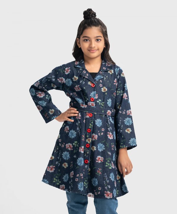 Kid girls floral printed A-line jacket in denim fabric. Lapel collar, long sleeves. Buttons fasten at the front and waist belt.