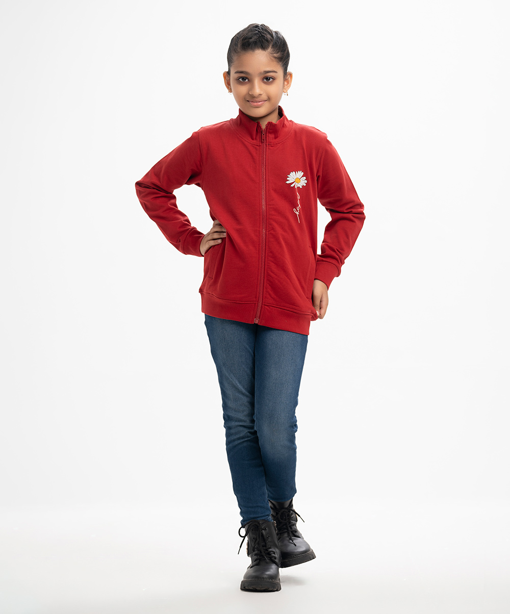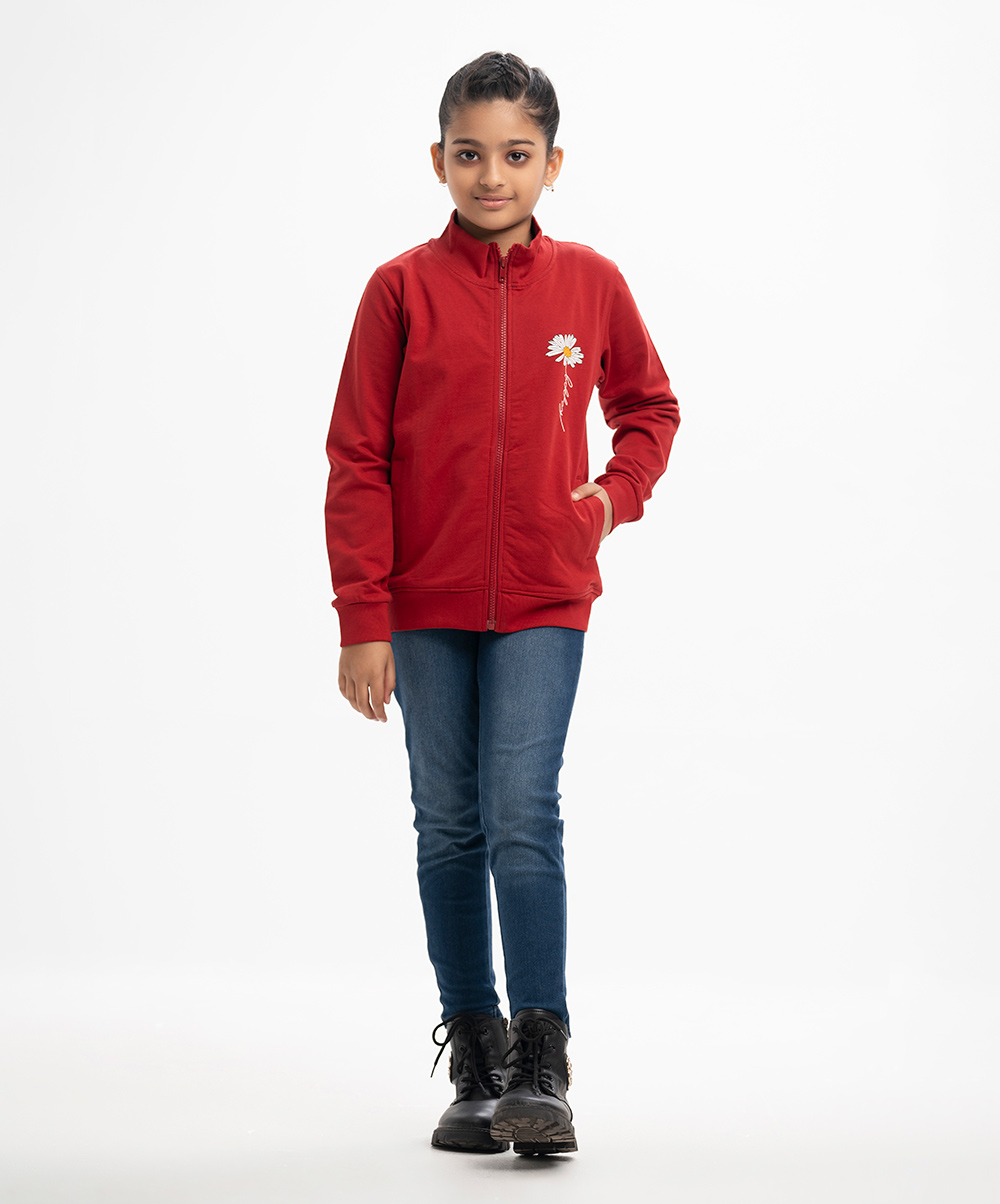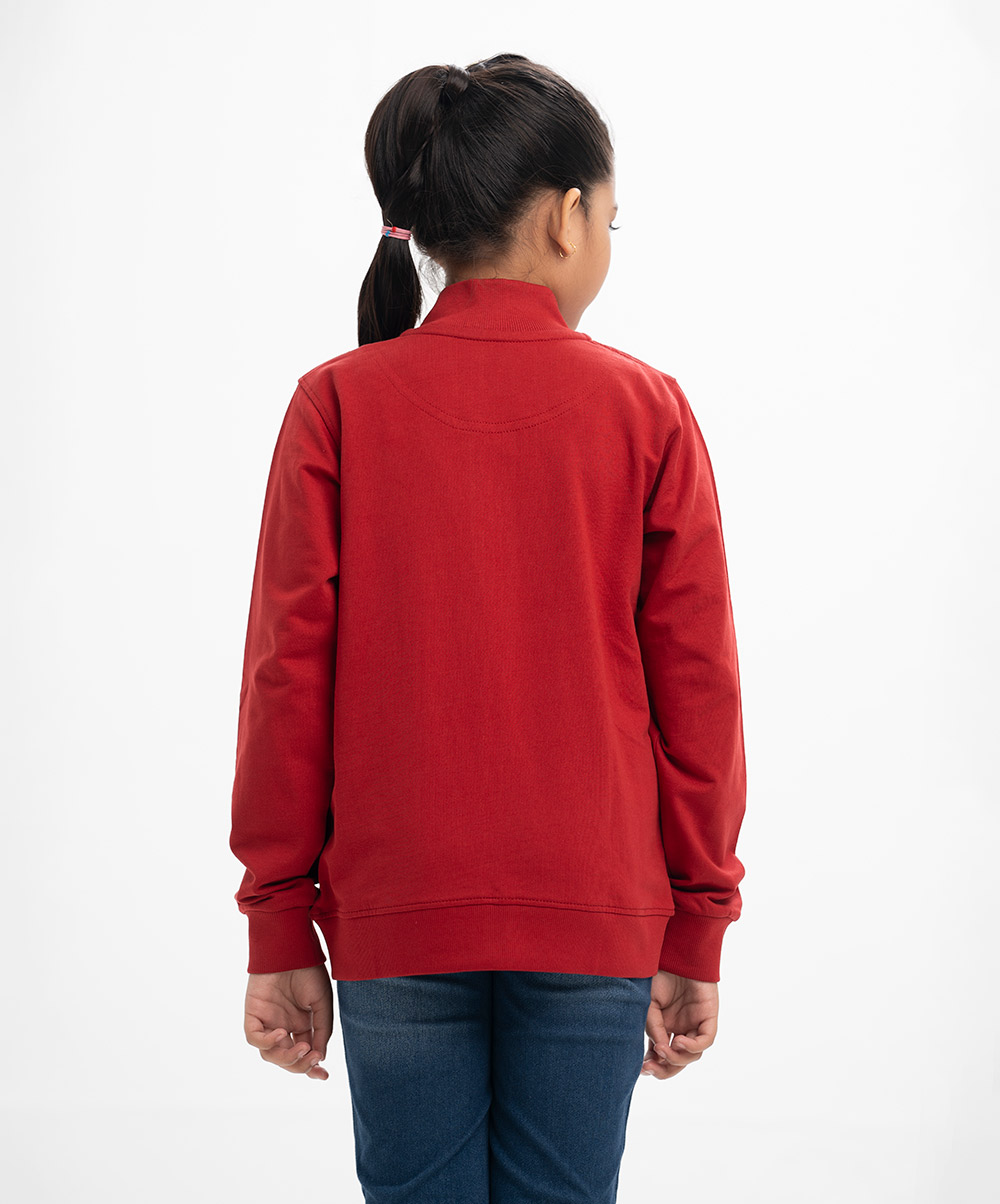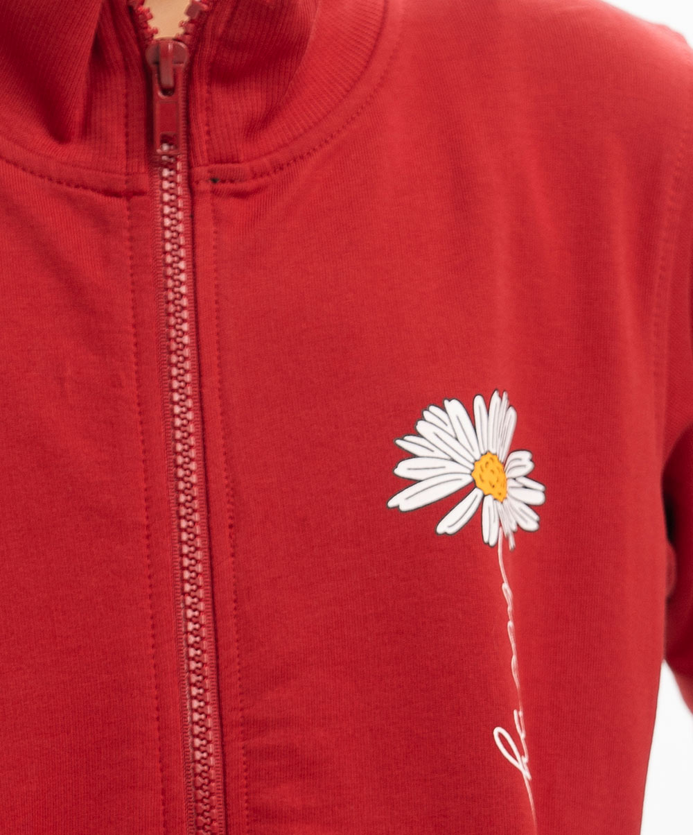 High-neck sweatshirt in French terry fabric. Full-sleeved with ribbed collar and cuffs. Zipper opening and kangaroo pockets at the front. Printed on the chest.