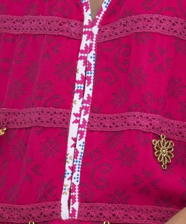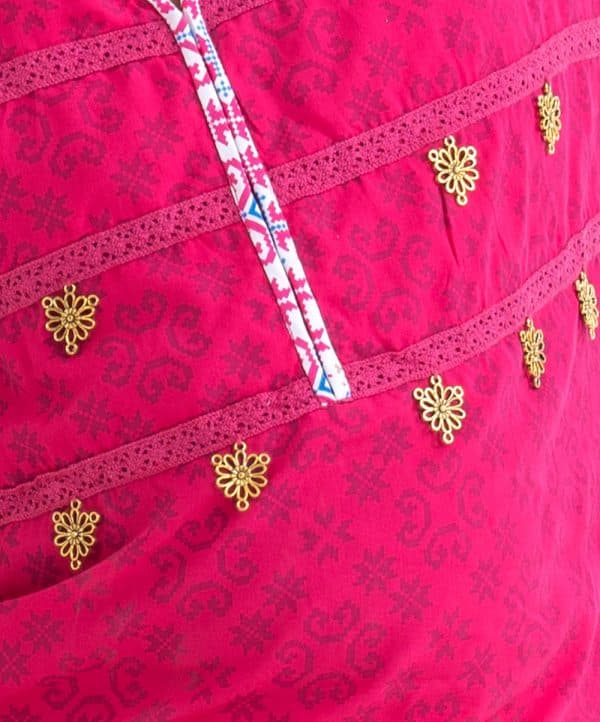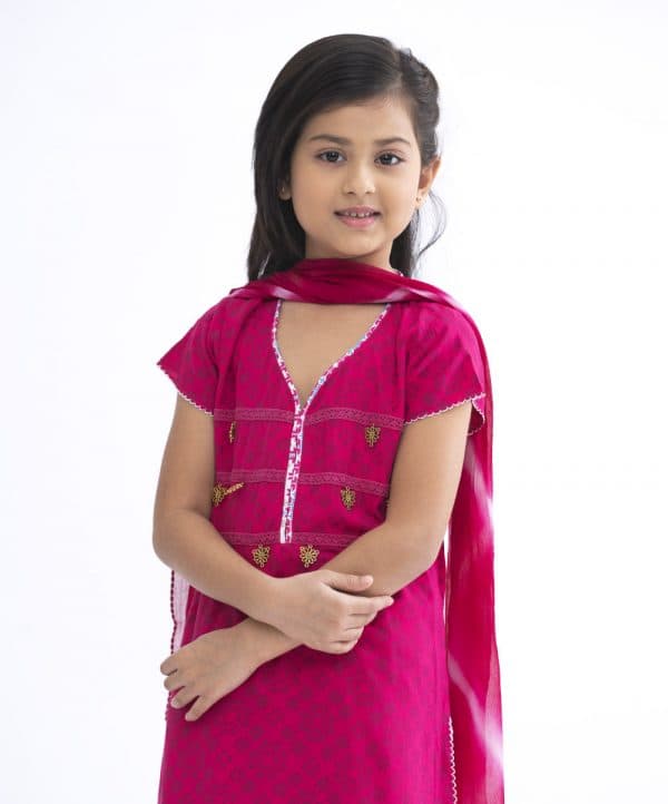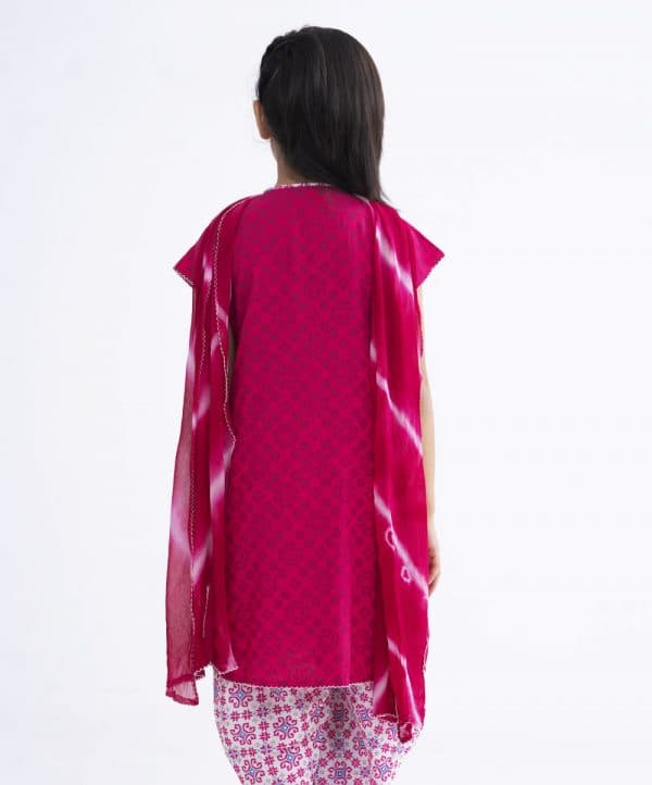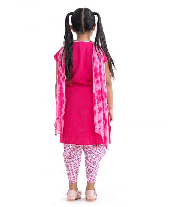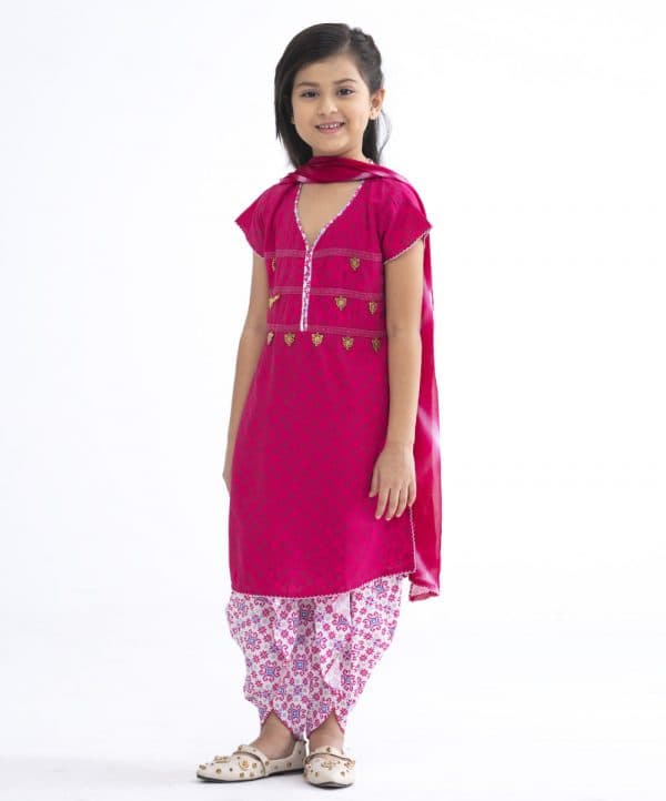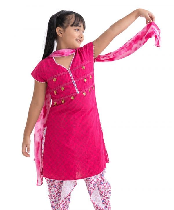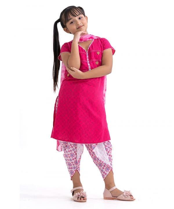 Pink Salwar Kameez in Cotton Viscose fabric with Chiffon dupatta. Printed dhuti pajama & solid kameez.