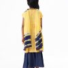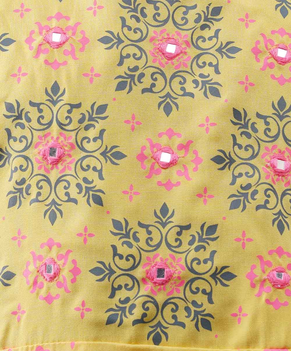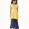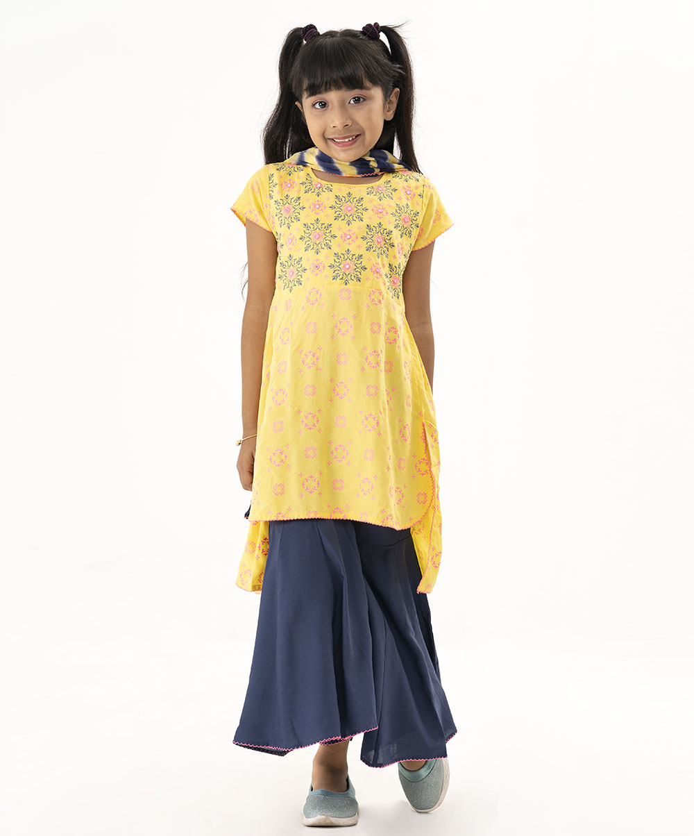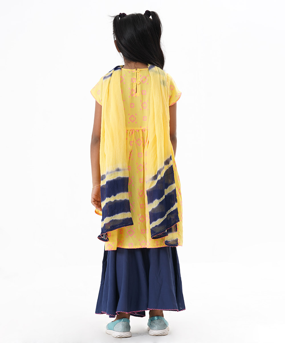 Yellow soft viscose high-low hem kameez with allover print and gathers at back. Comes with blue viscose sharara and tie dyed dupatta.