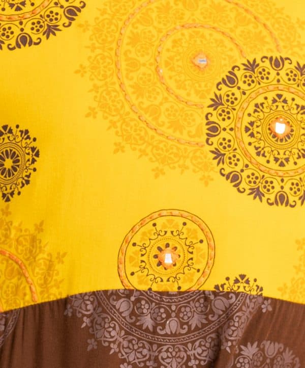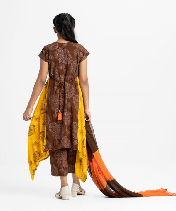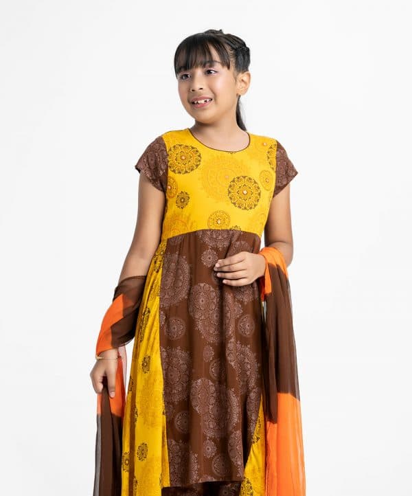 Kid girls printed elongated hem Salwar Kameez in viscose fabric. Round neck, cap sleeves and karchupi at front. Chiffon dupatta with palazzo pants.