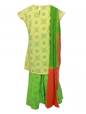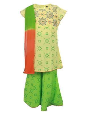 Kids girl A-line salwar kameez in viscose fabric. Round neck, three-quarter sleeved. Embroidery and slit at the front. Completed with palazzo pant and Tie-dye chiffon dupatta