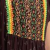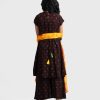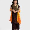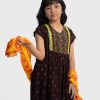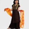 Kid girls printed A-line salwar kameez in viscose fabric. V-neck, cap sleeves, tassel tie at waistline and embroidery at the front of kameez. Palazzo pants and tie-dye chiffon dupatta.