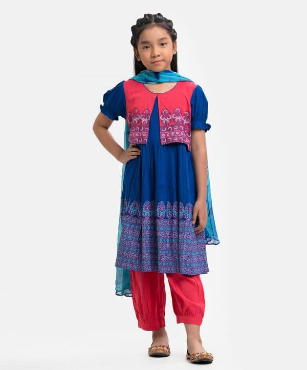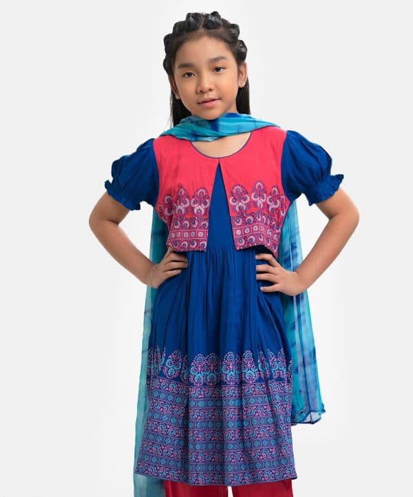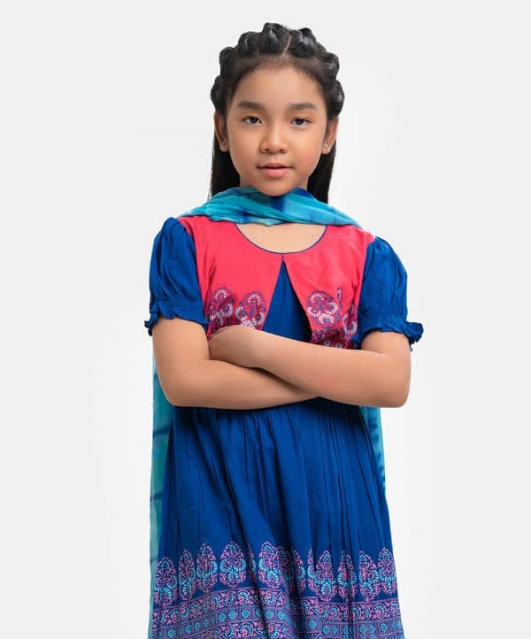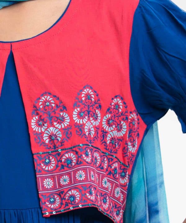Frock-style salwar kameez in viscose fabric. Koti design at the front with sequins. Puff-sleeves. Elasticated pajama, complemented with a matching dupatta.