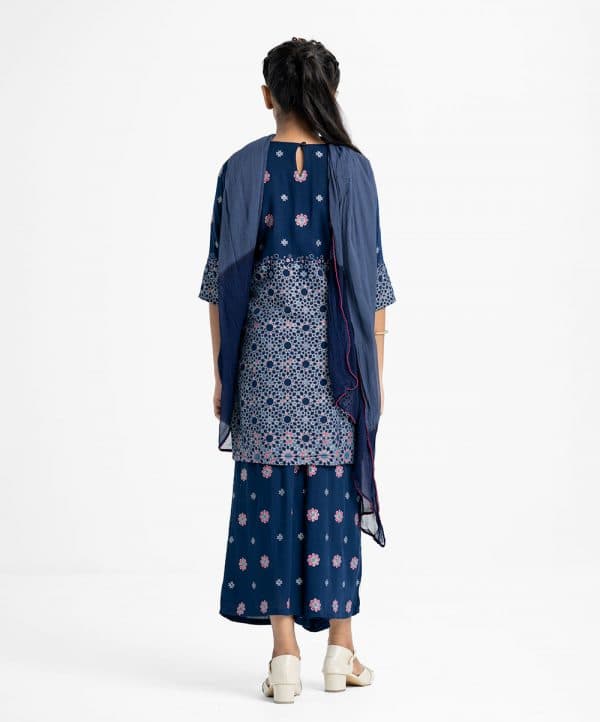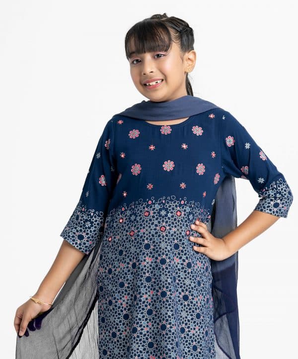 Kid girl’s printed straight Salwar Kameez in viscose fabric. Round neck, three-quarter sleeves and karchupi at front. Chiffon dupatta with skirt palazzo pants.