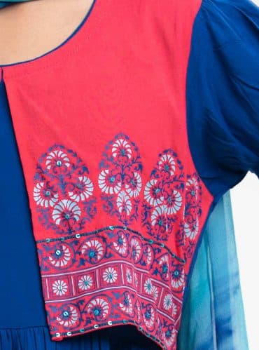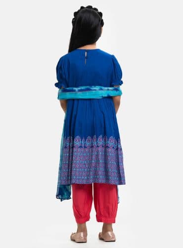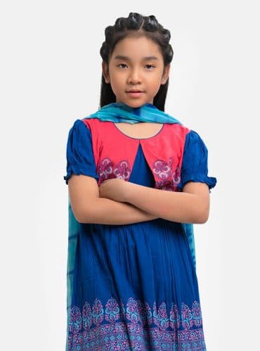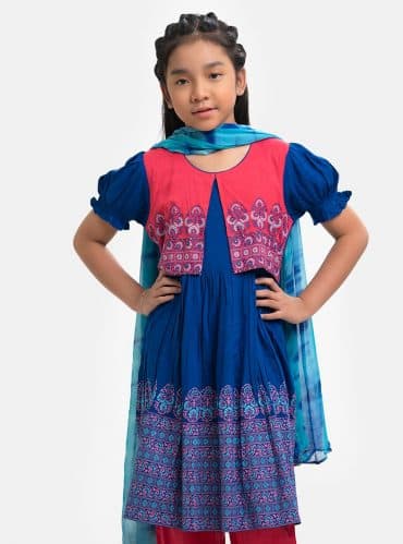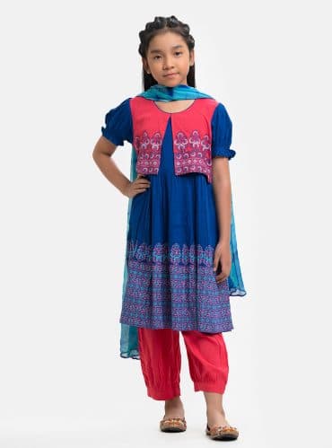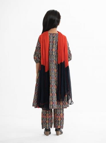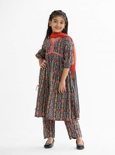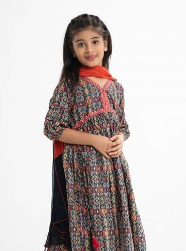 Kid girl’s printed straight Salwar Kameez in viscose fabric. Round neck, three-quarter sleeves and karchupi at front. Chiffon dupatta with skirt palazzo pants.