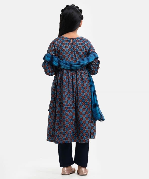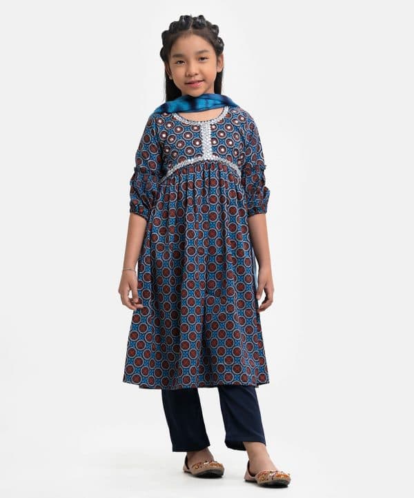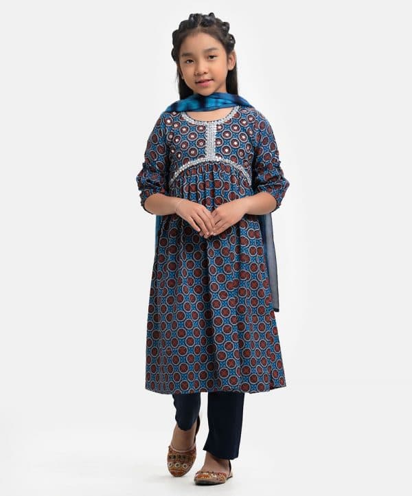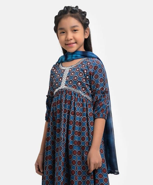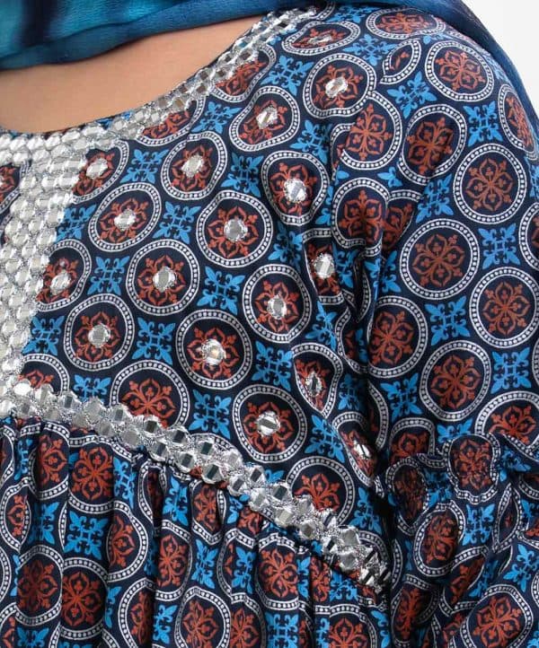 Gown-style salwar kameez set in joom fabric. Round neck, lantern sleeved, half viscose lining inside. Embroidery at the front. Complemented with an elasticated waist pajama.