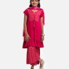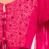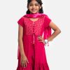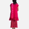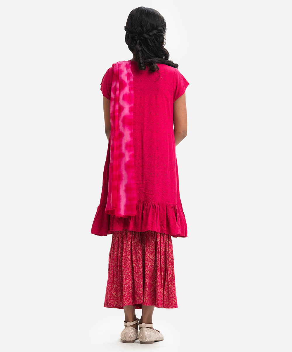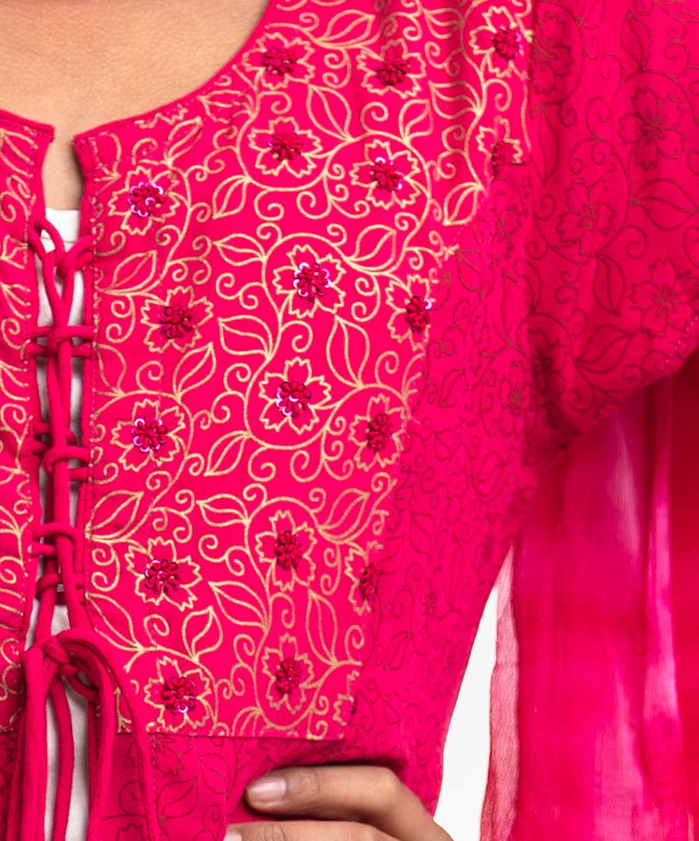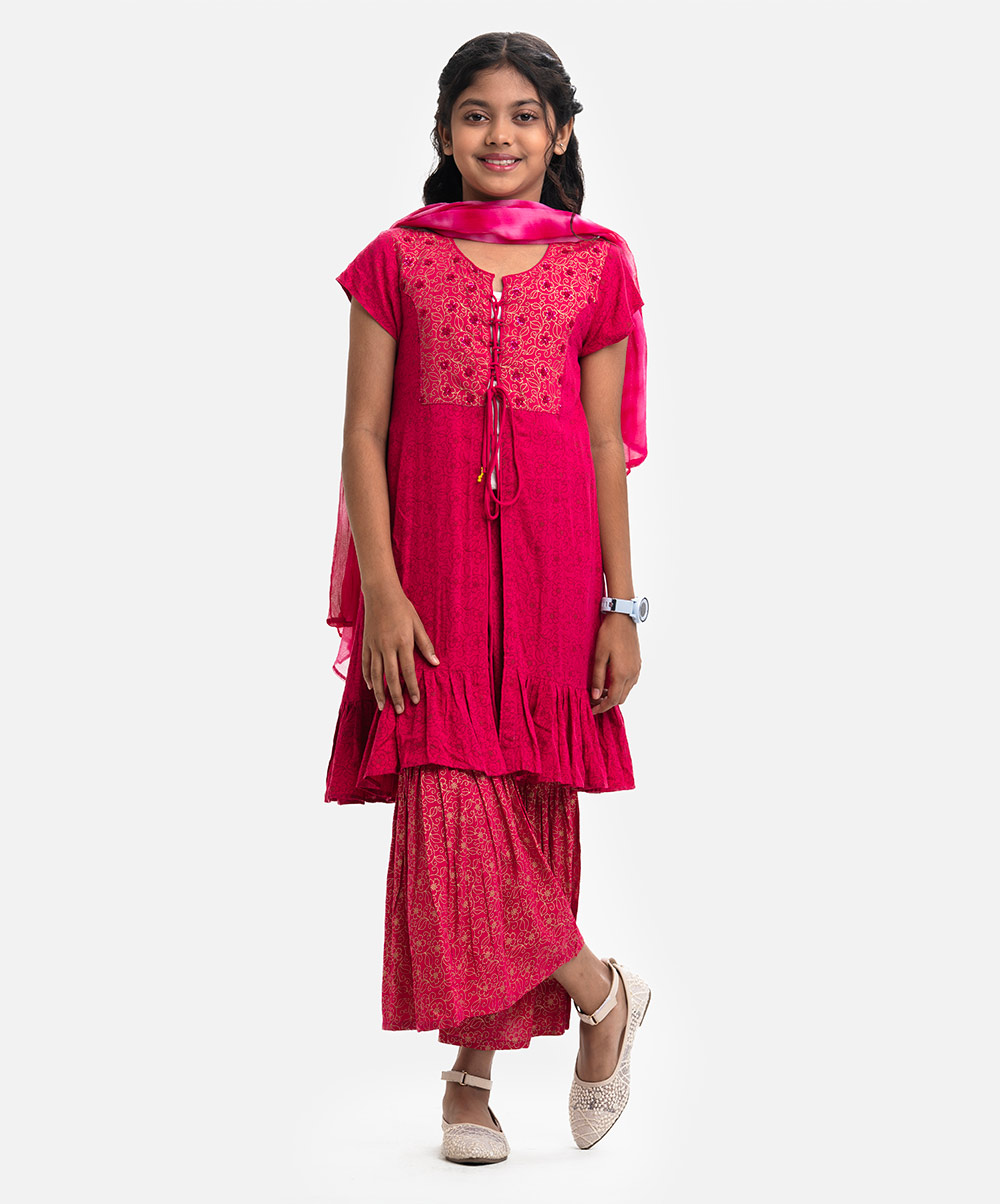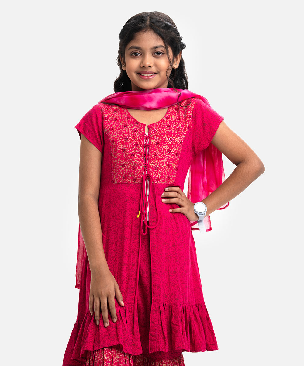 Crisscross closed viscose kameez with cap sleeves and embroidery at the front. Paired with a sharara and a matching dupatta.