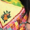 Round neck A-line kameez in cotton fabric. Lantern sleeves, embroidery at the front. Complemented with a wide leg palazzo and a matching dupatta.