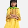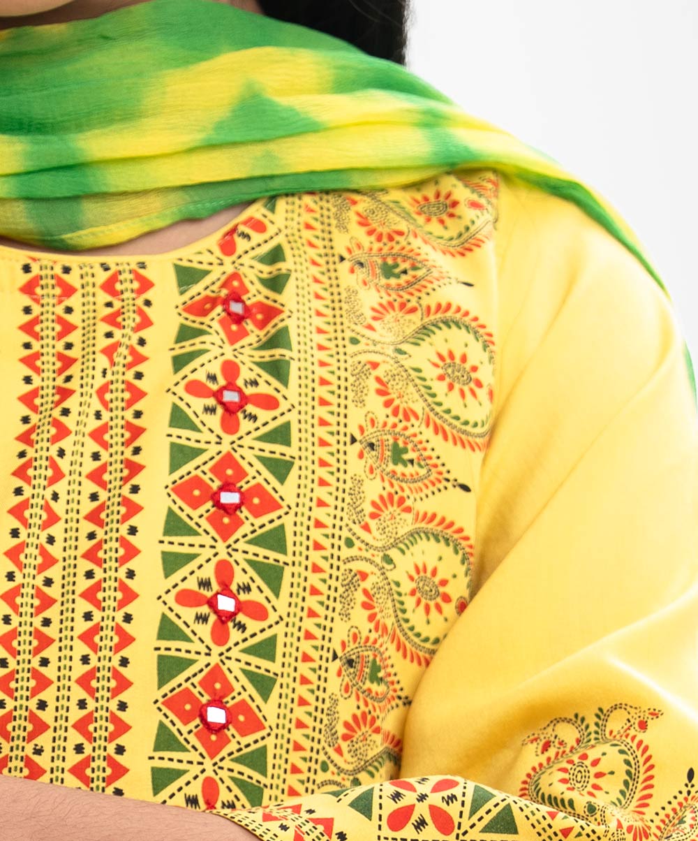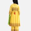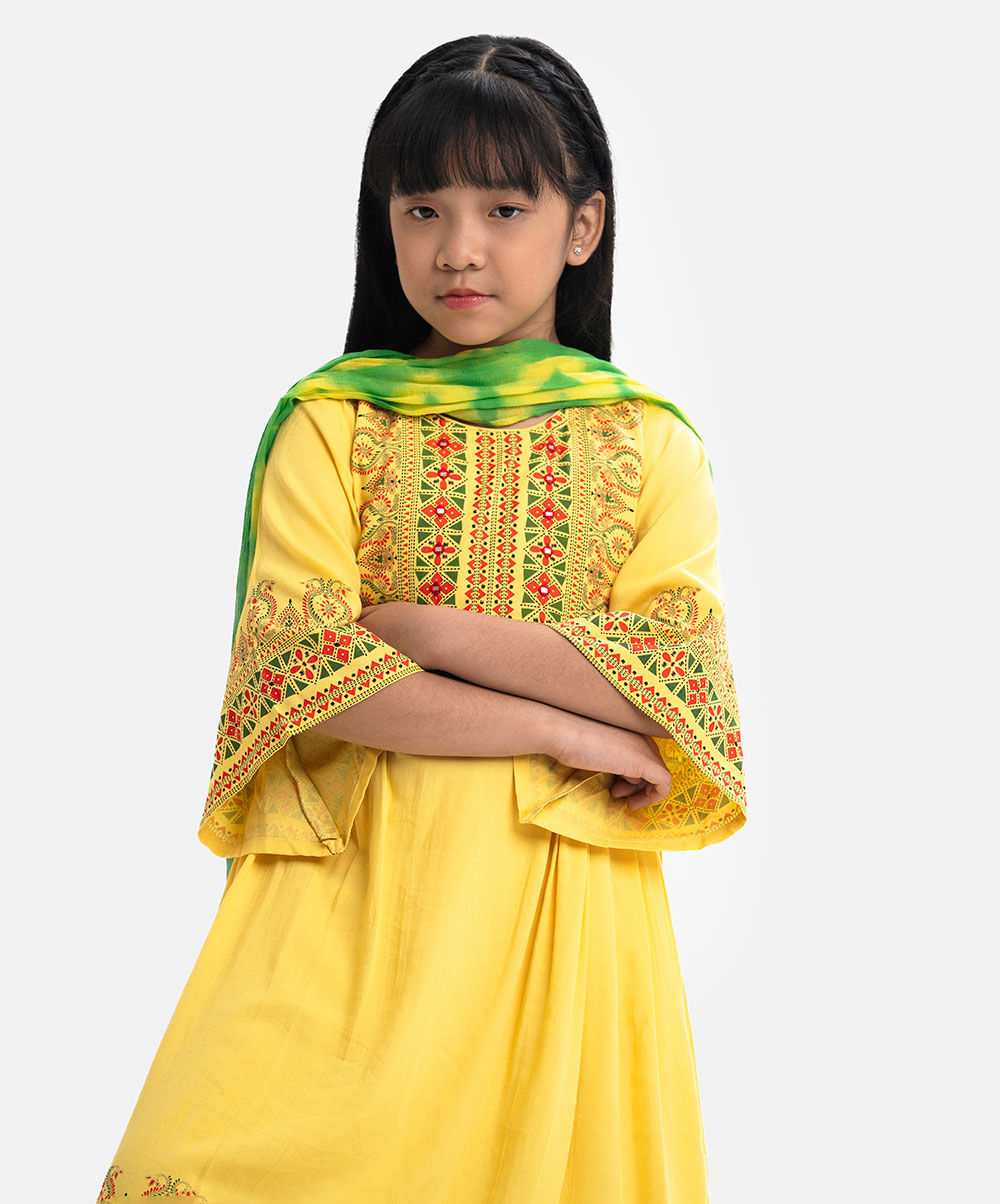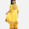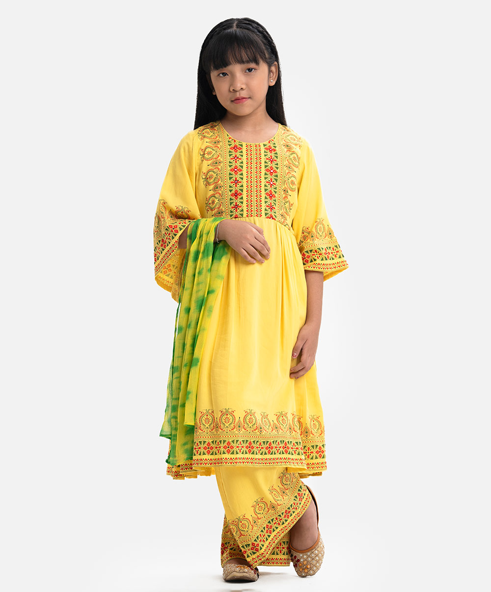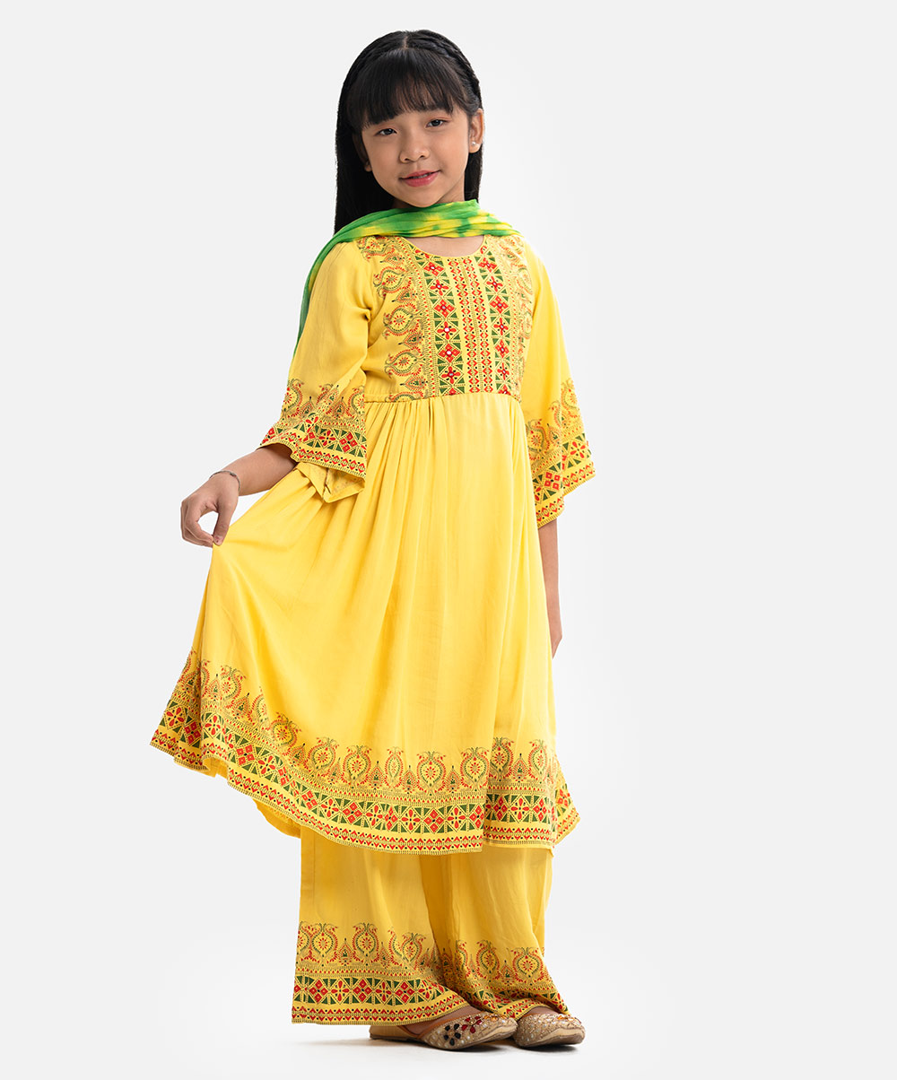 Round neck salwar kameez in viscose fabric. Bell sleeves and tassel-tie at the waist. Matching palazzo pants with a dupatta.