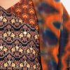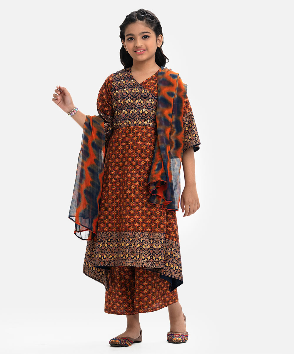 Retro wrap style cotton salwar kameez with tassel cords. Bell sleeves, elongated hemline with karchupi at the front. Wide-leg pajama with a matching dupatta.