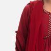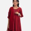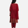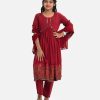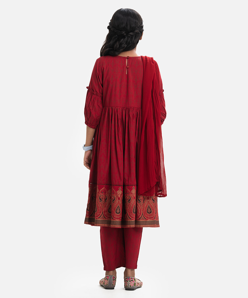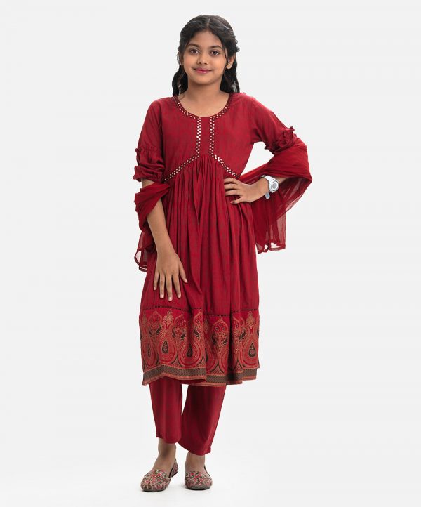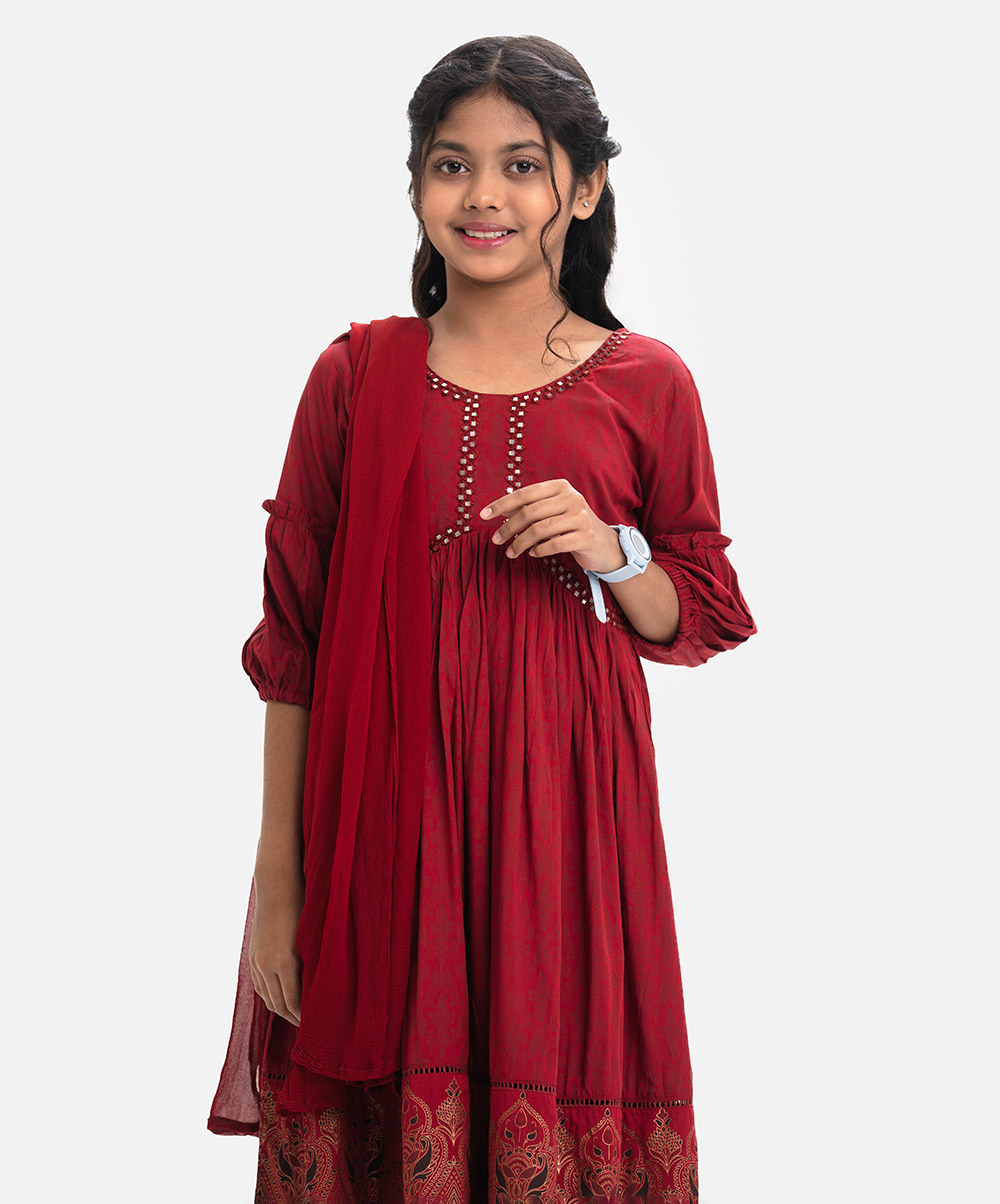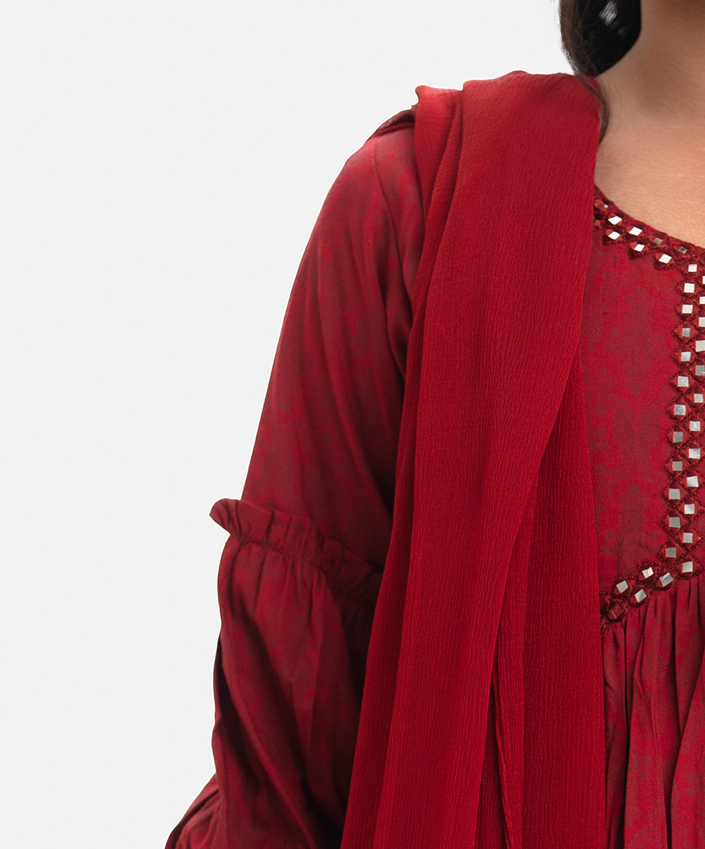Round neck A-line viscose kameez with lantern sleeves and embroidery. Viscose pajama with elasticated waistline. Comes with a matching dupatta.