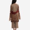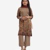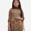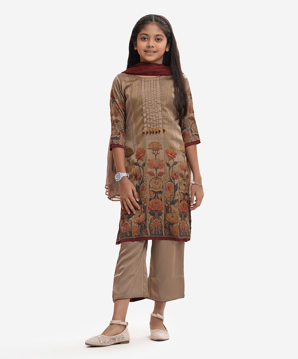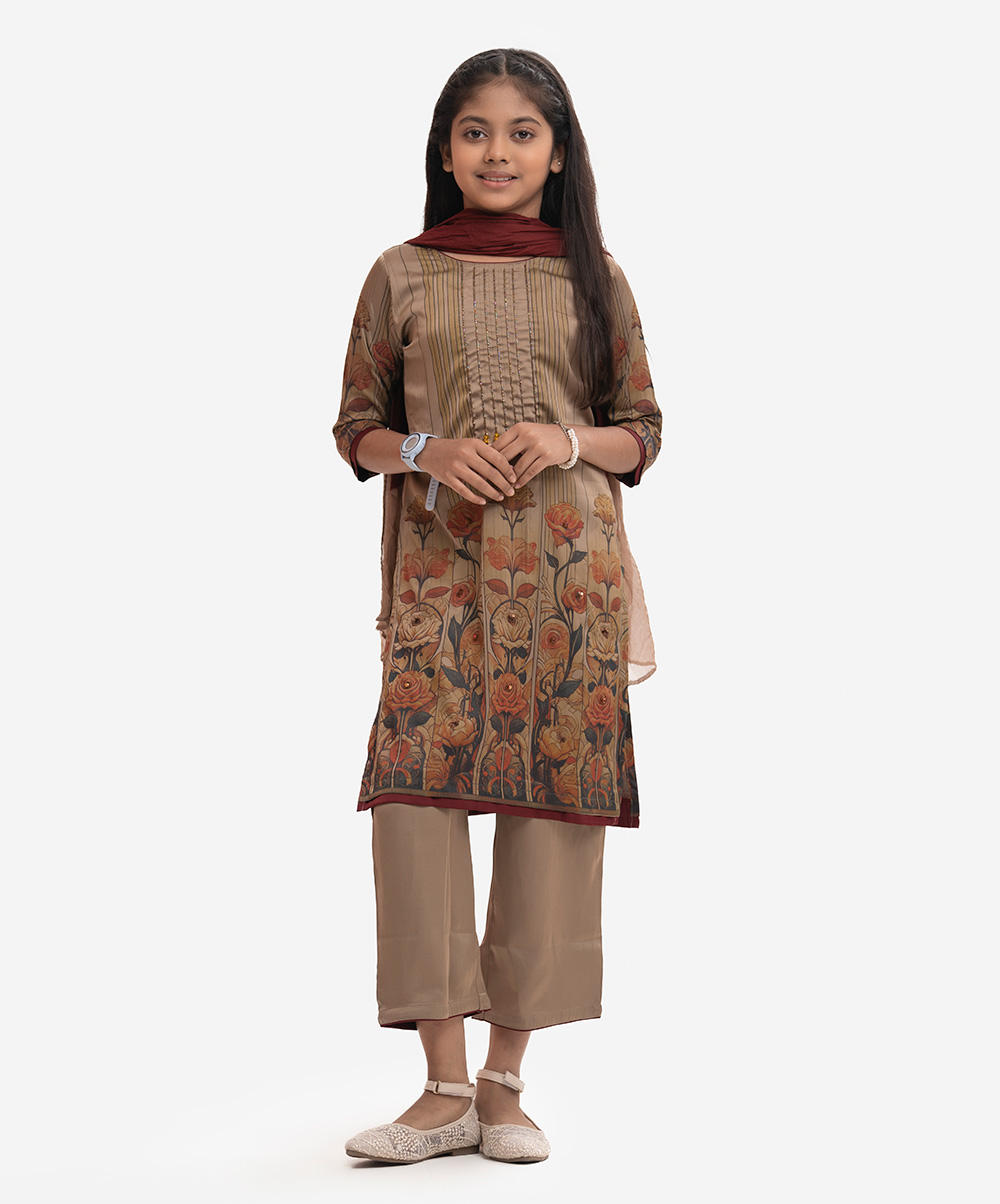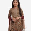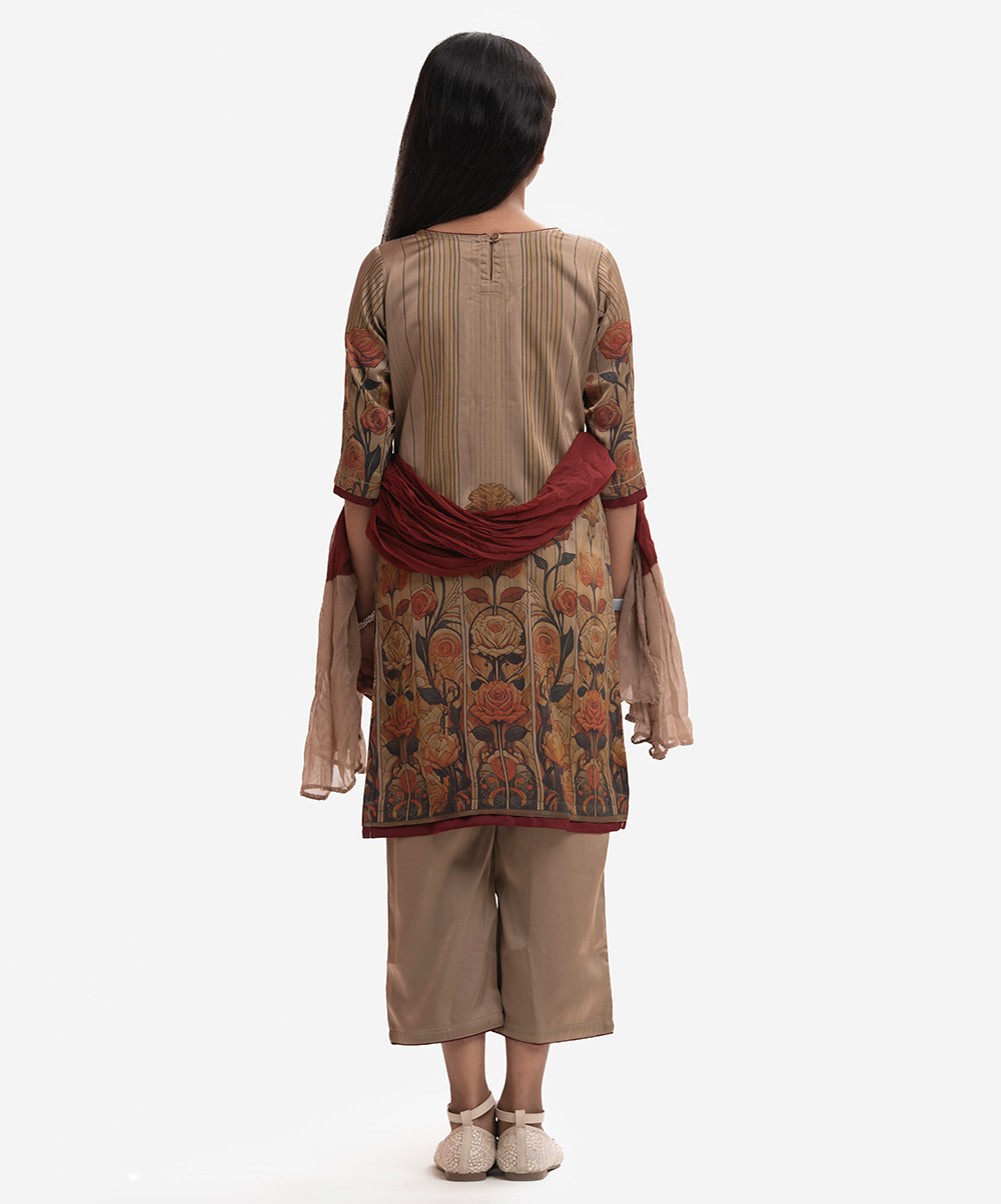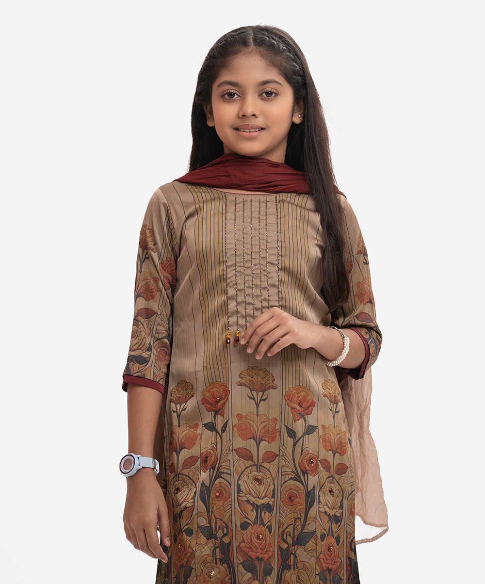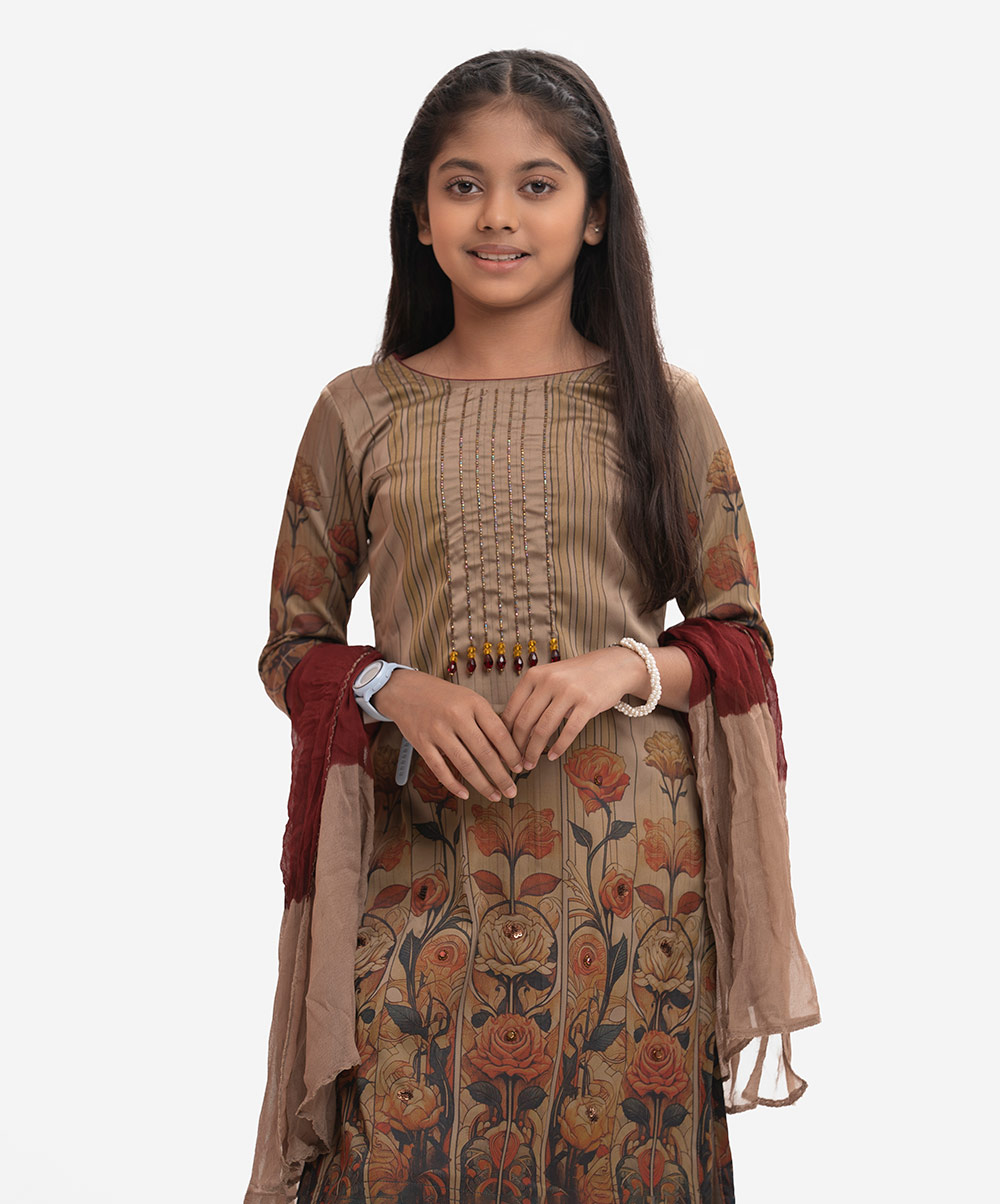 Round neck A-line salwar kameez with three-quarter sleeves and karchupi details in satin-georgette fabric. Complemented with a pant pajama and tie-dye chiffon fabric.