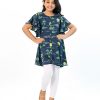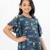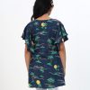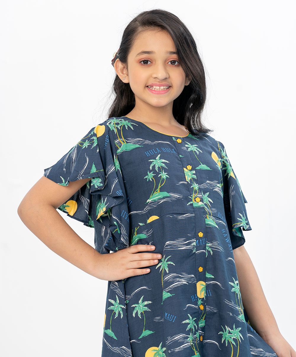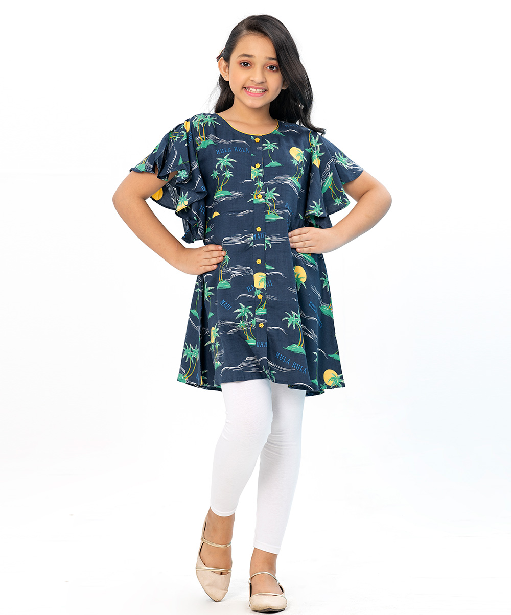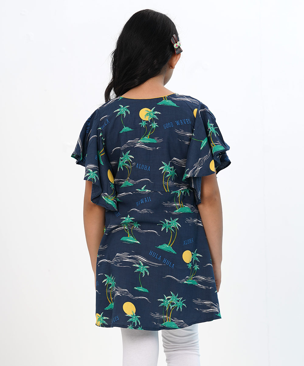 Blue printed viscose tunic with flutter sleeves. Embellished with front button placket and contrast flower buttons.