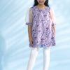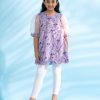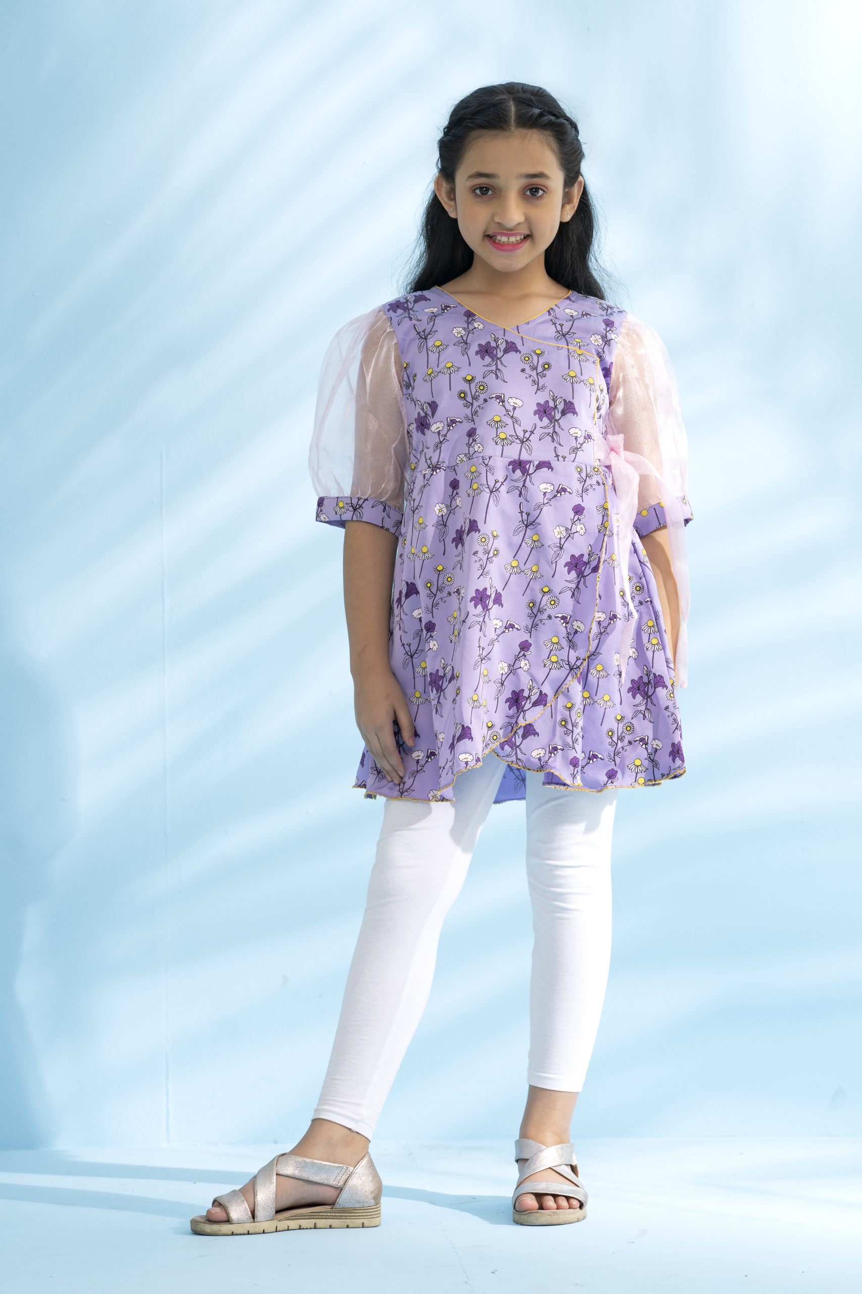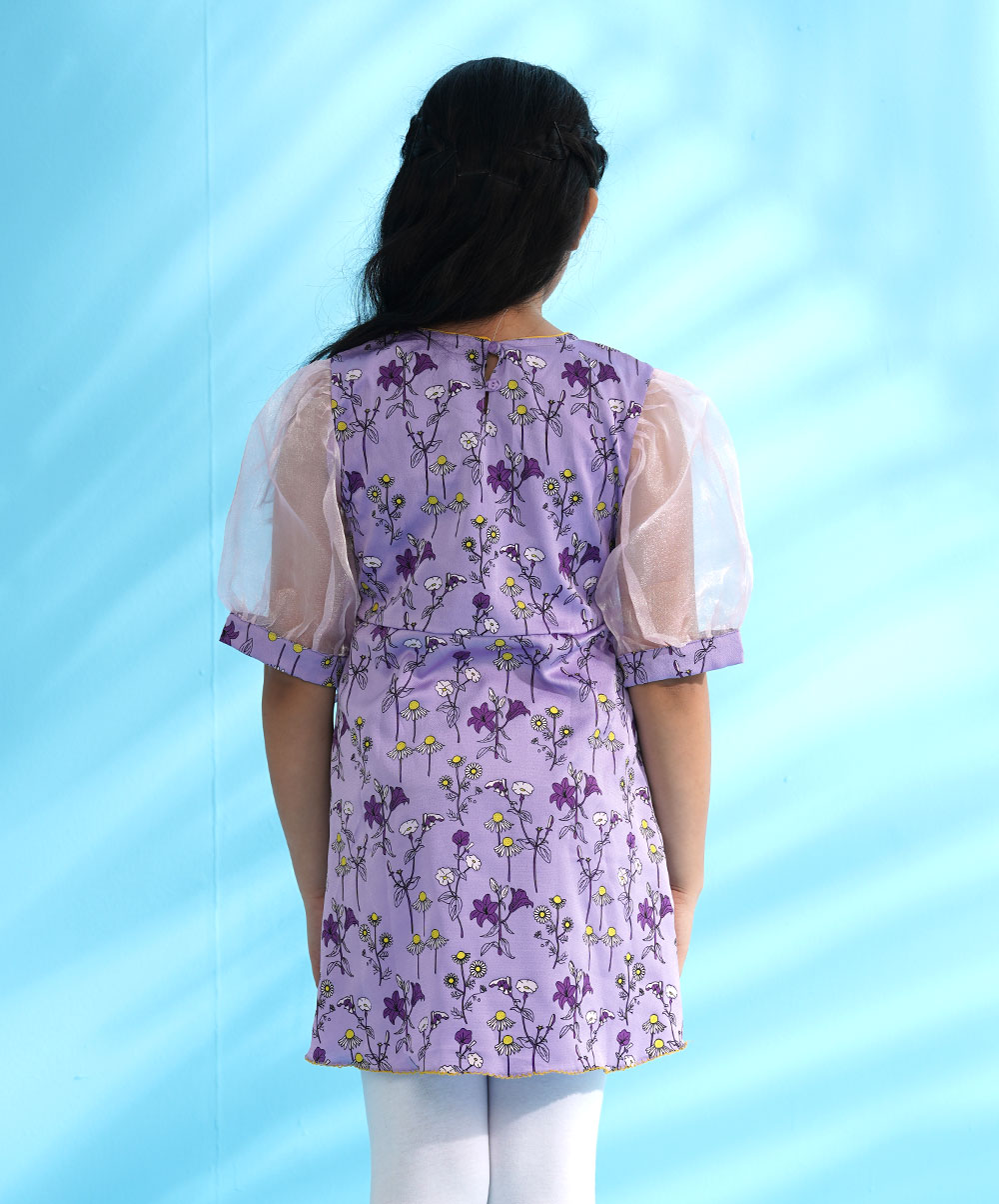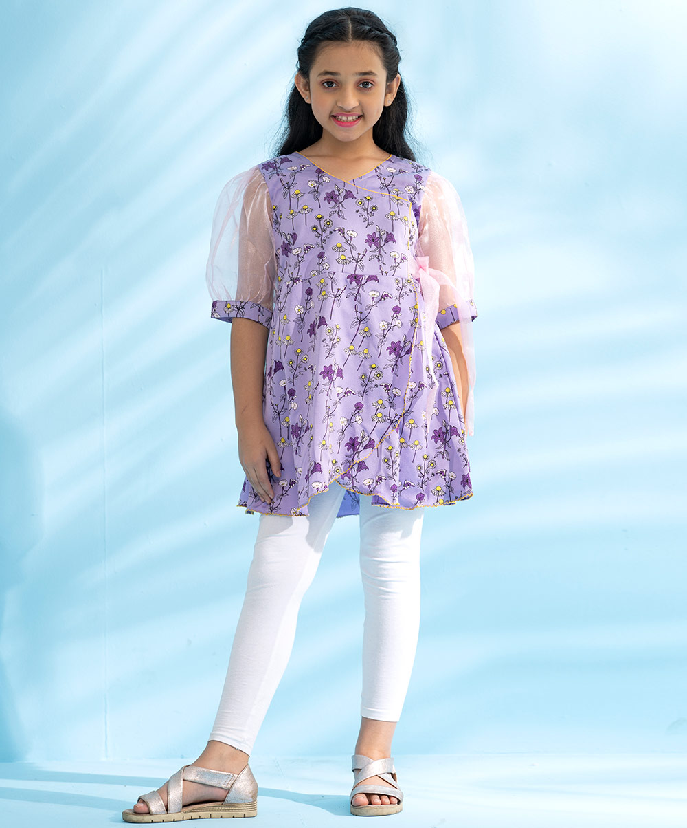Wrap style tunic in printed crepe silk. Comes with organza puff sleeves and tie belt on the side.