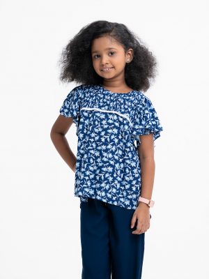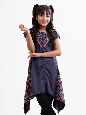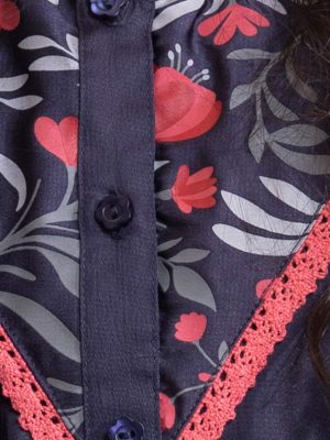 Kid girls A-line tunic in floral printed georgette fabric. Three quarter puff sleeved, lace work and pin tuck at front.