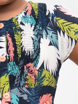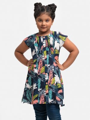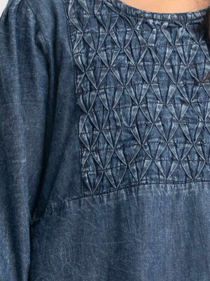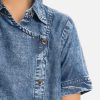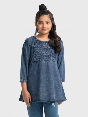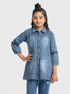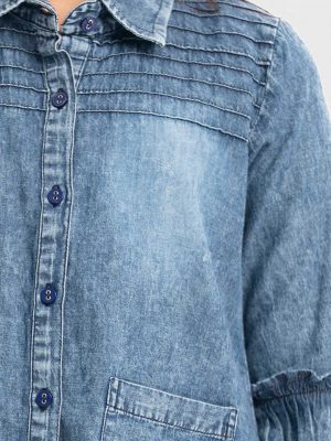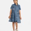 Kids girl A-line retro wrap style tunic in denim fabric. Classic collar, Short sleeved. Button fastening at the front. inseam pockets and attached patch at the front.