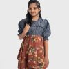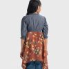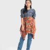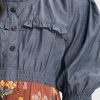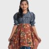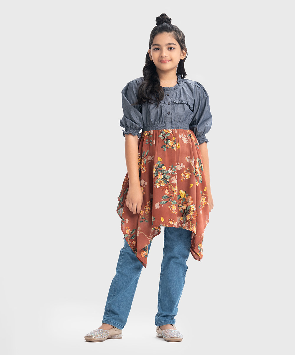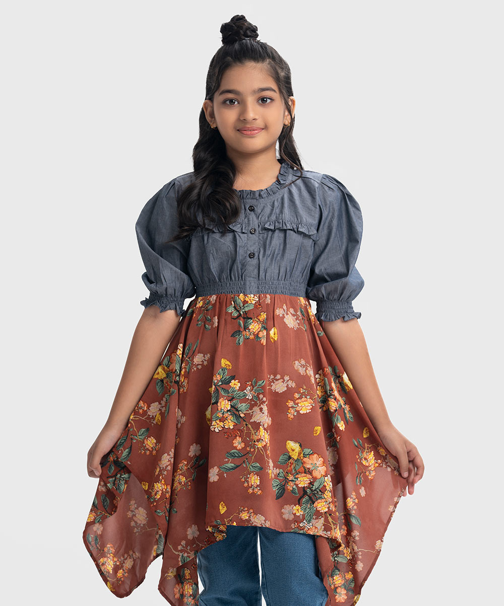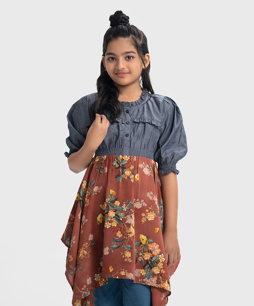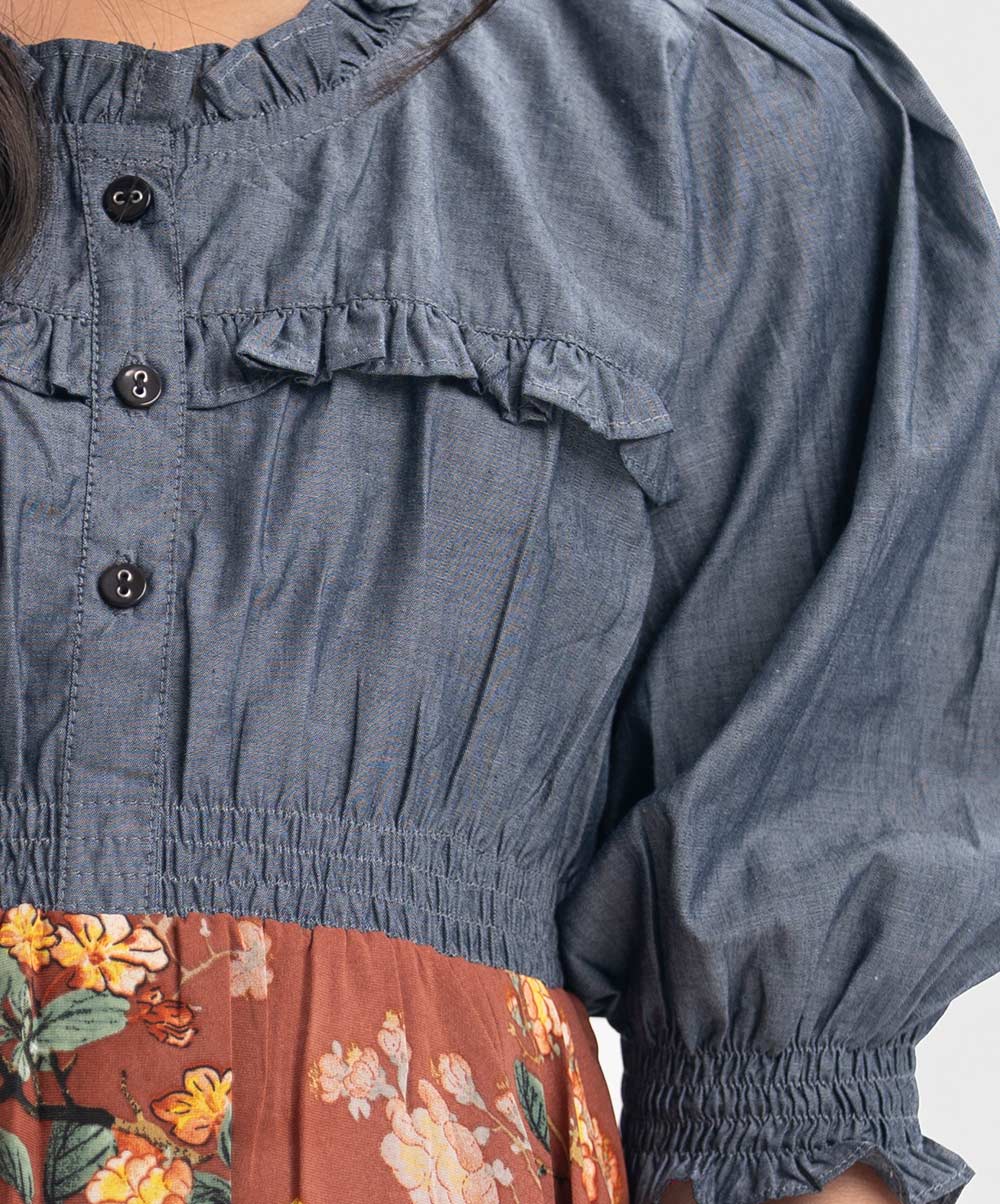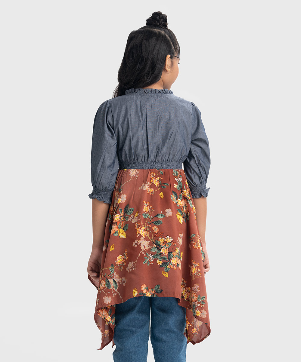 Round-neck tunic in cotton and georgette, with frill details. Smocked waistline, bishop sleeved.