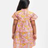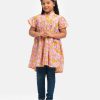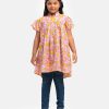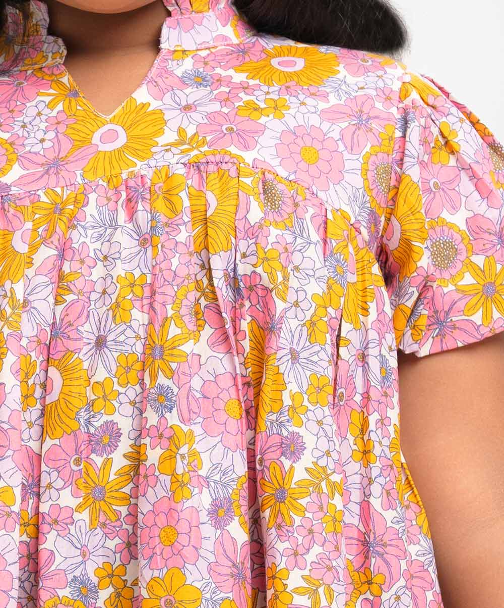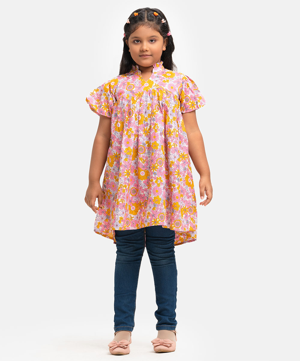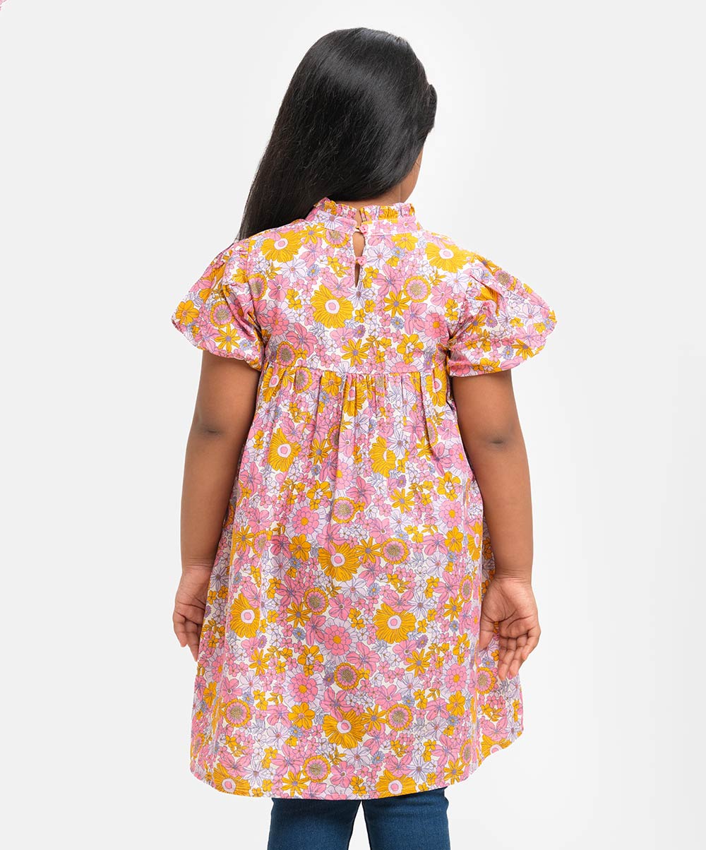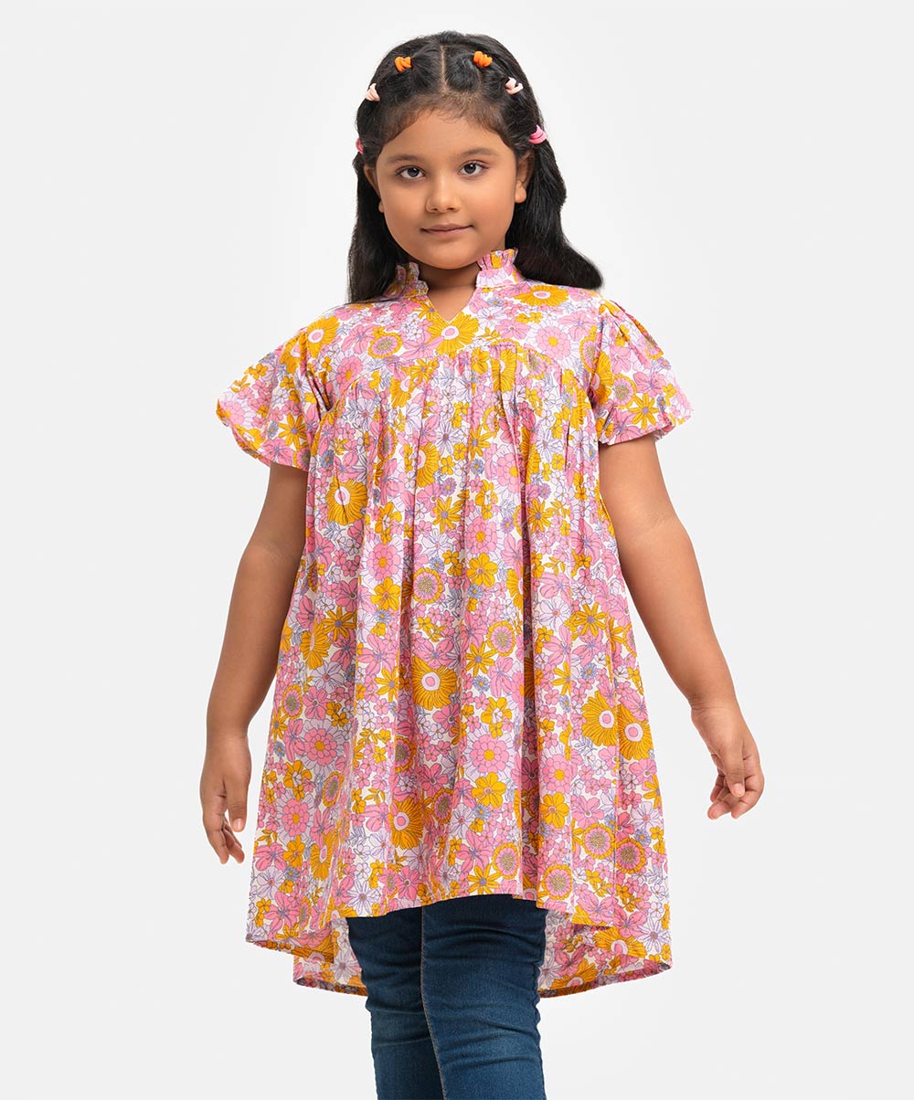 Kid girls’ printed tent-style tunic in cotton fabric. Ruffle neck, puff sleeves and gathered at the waistline.