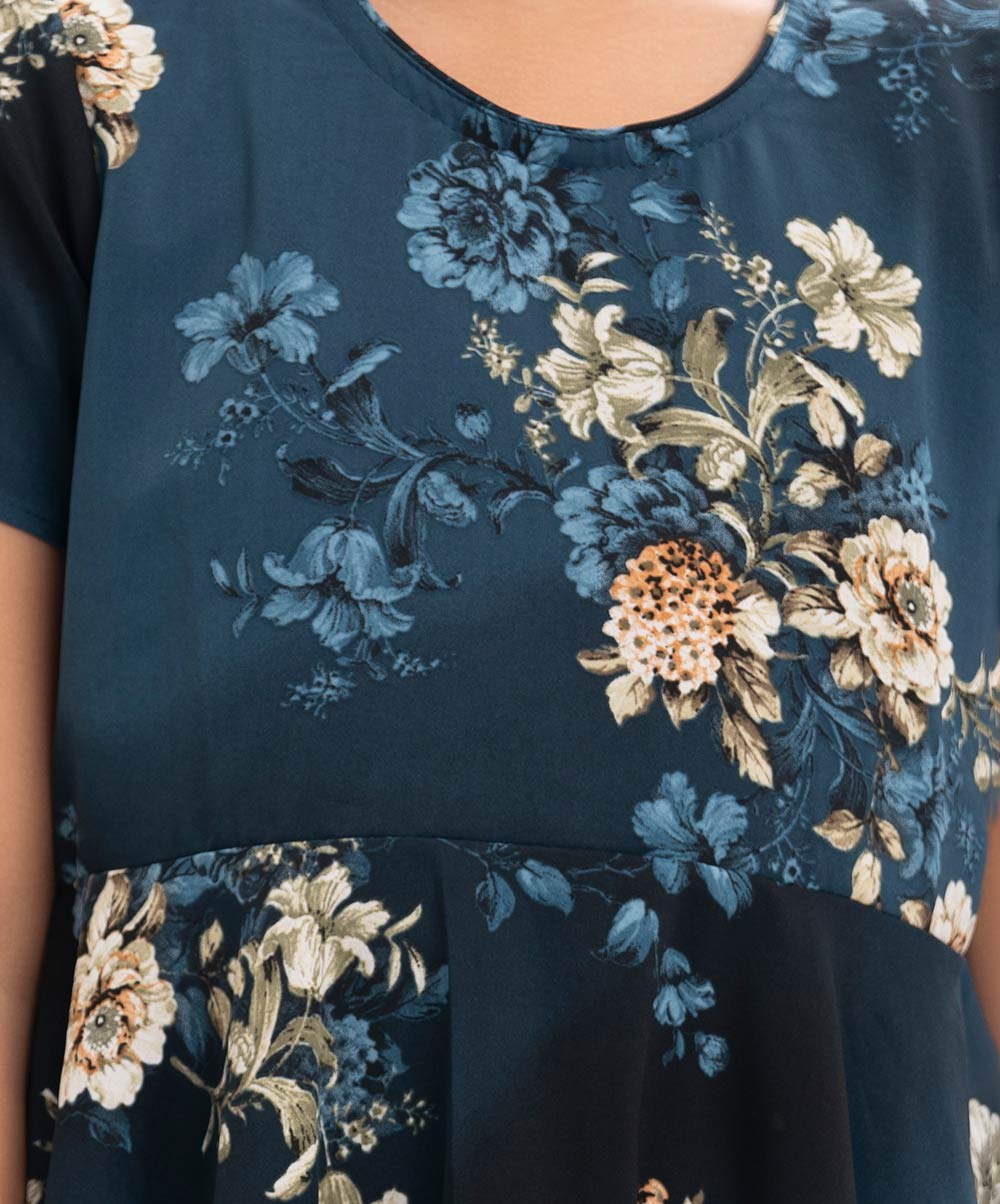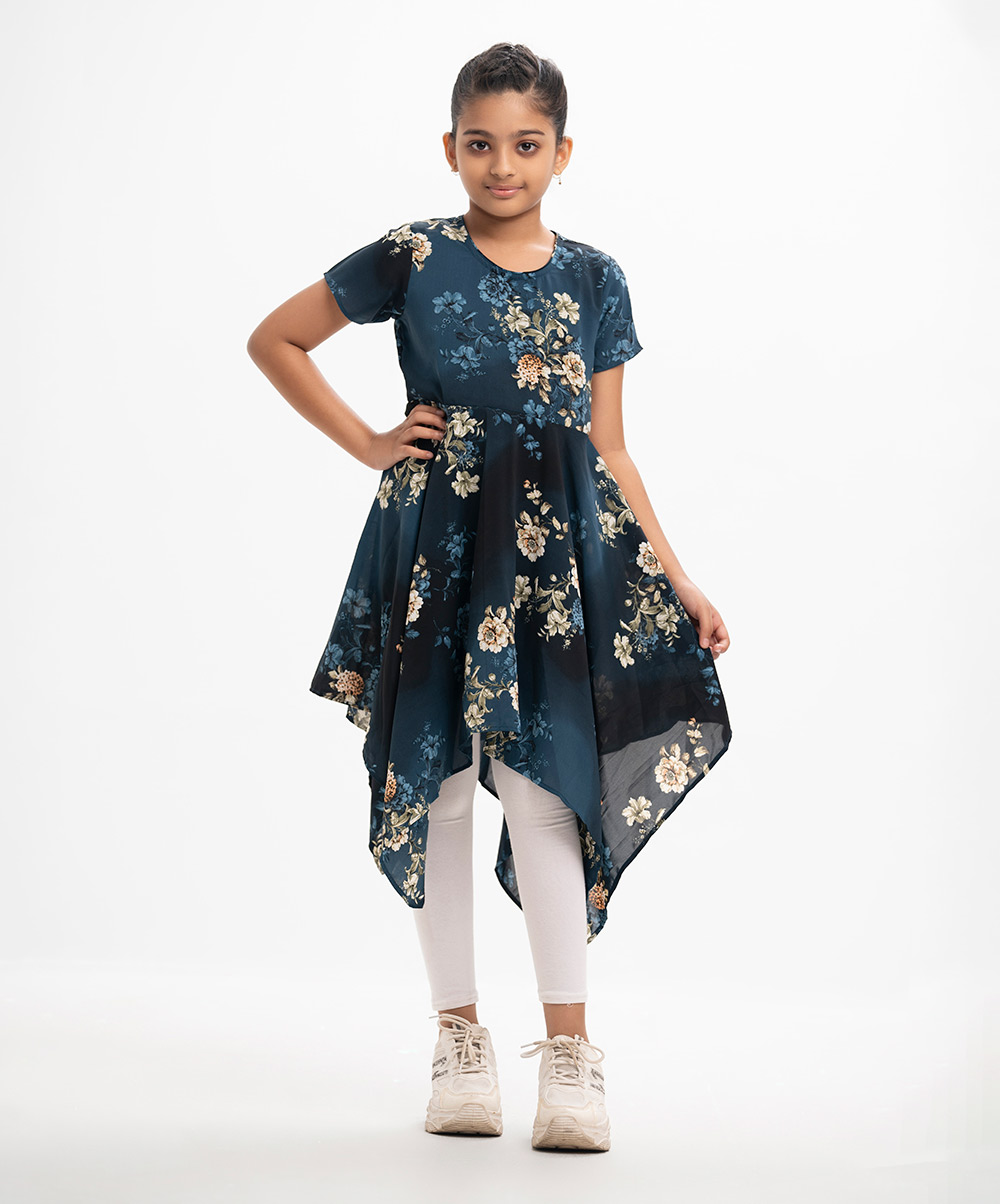 Cap-sleeved A-line frock in georgette fabric. Round neck with elongated hemline.