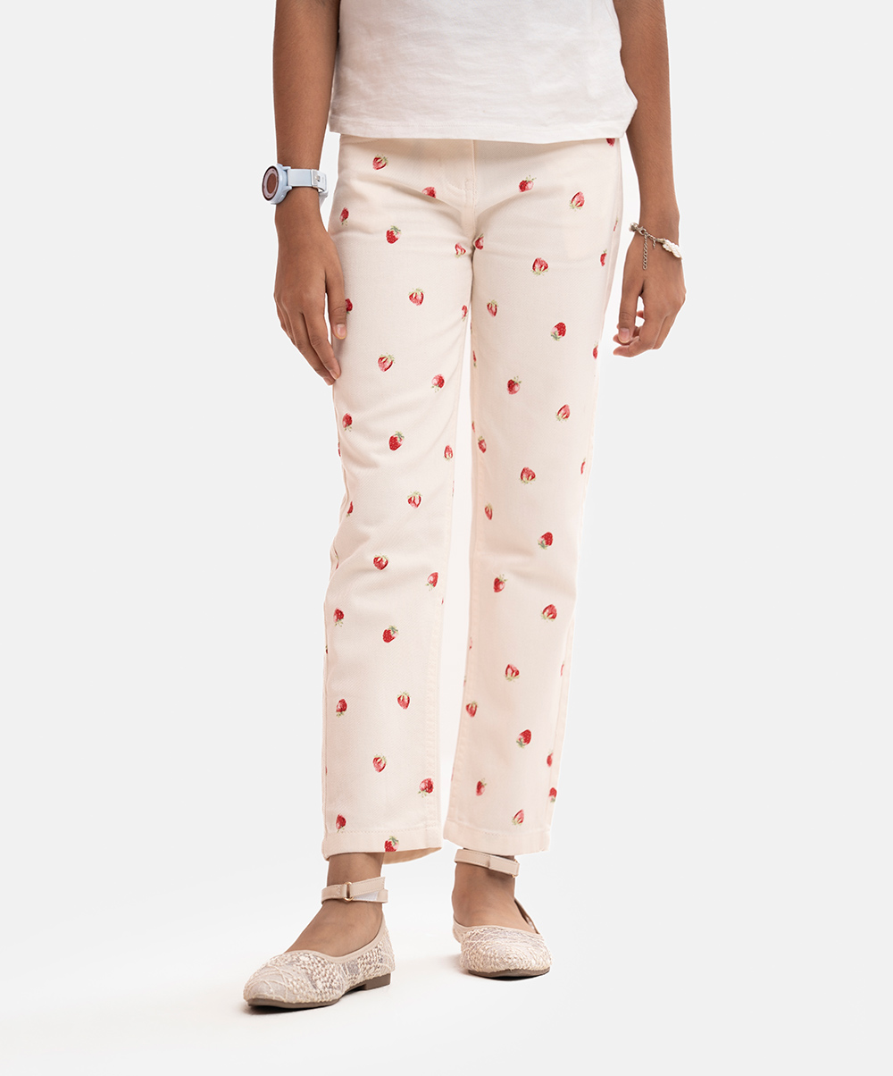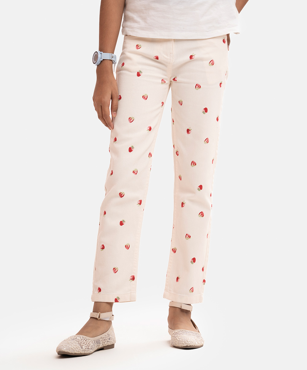 Kid girls’ printed woven long pants in twill cotton-blend fabric. Classic four-pocket styling with a zip fly.