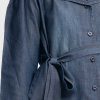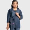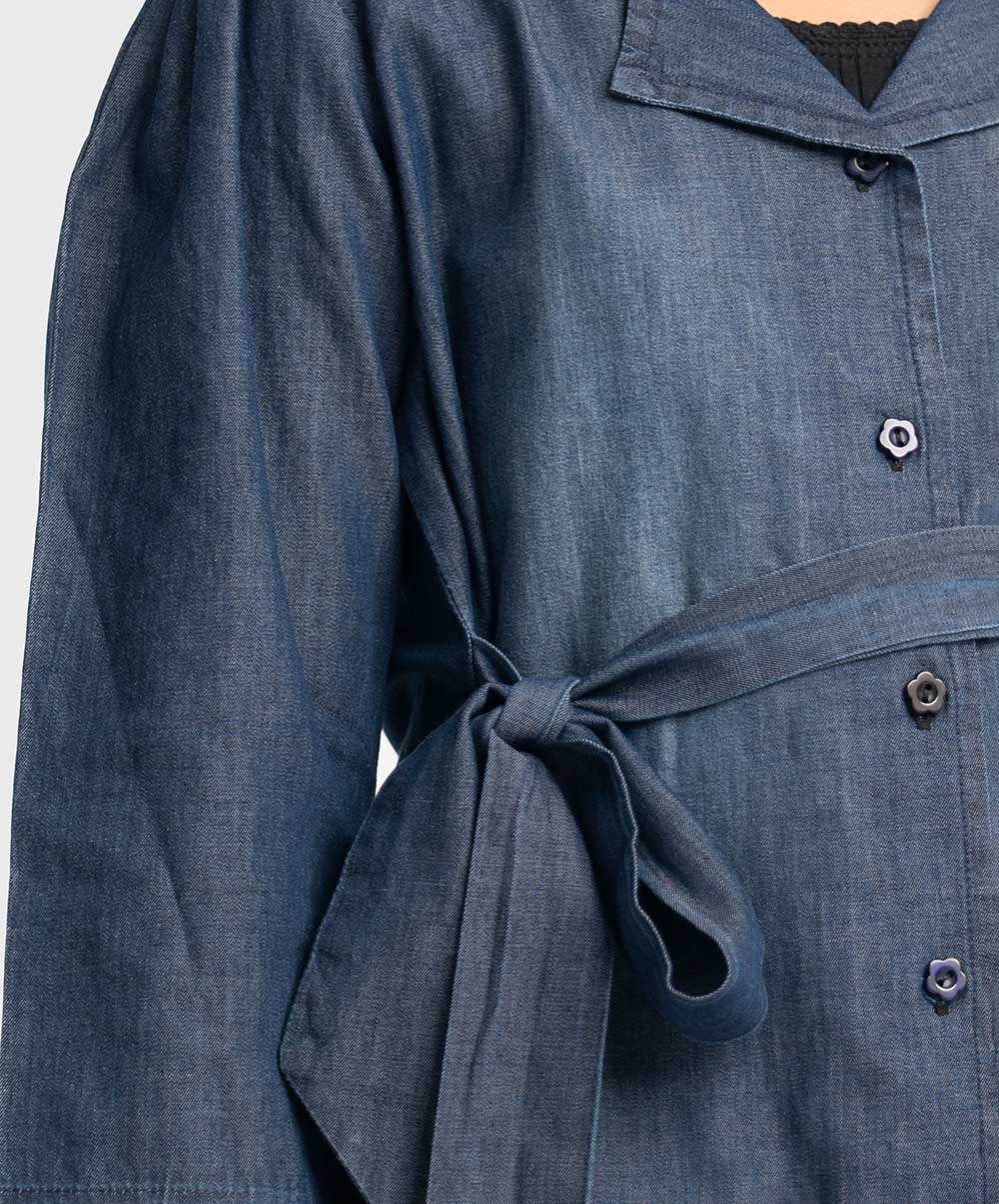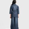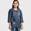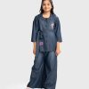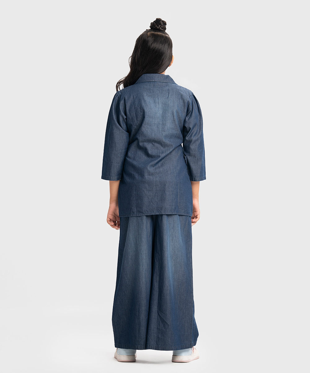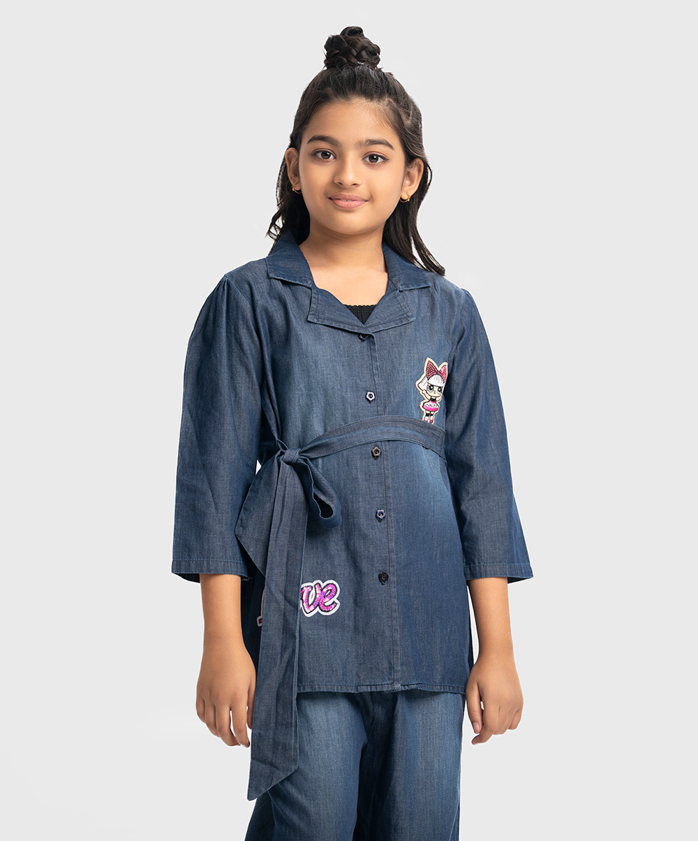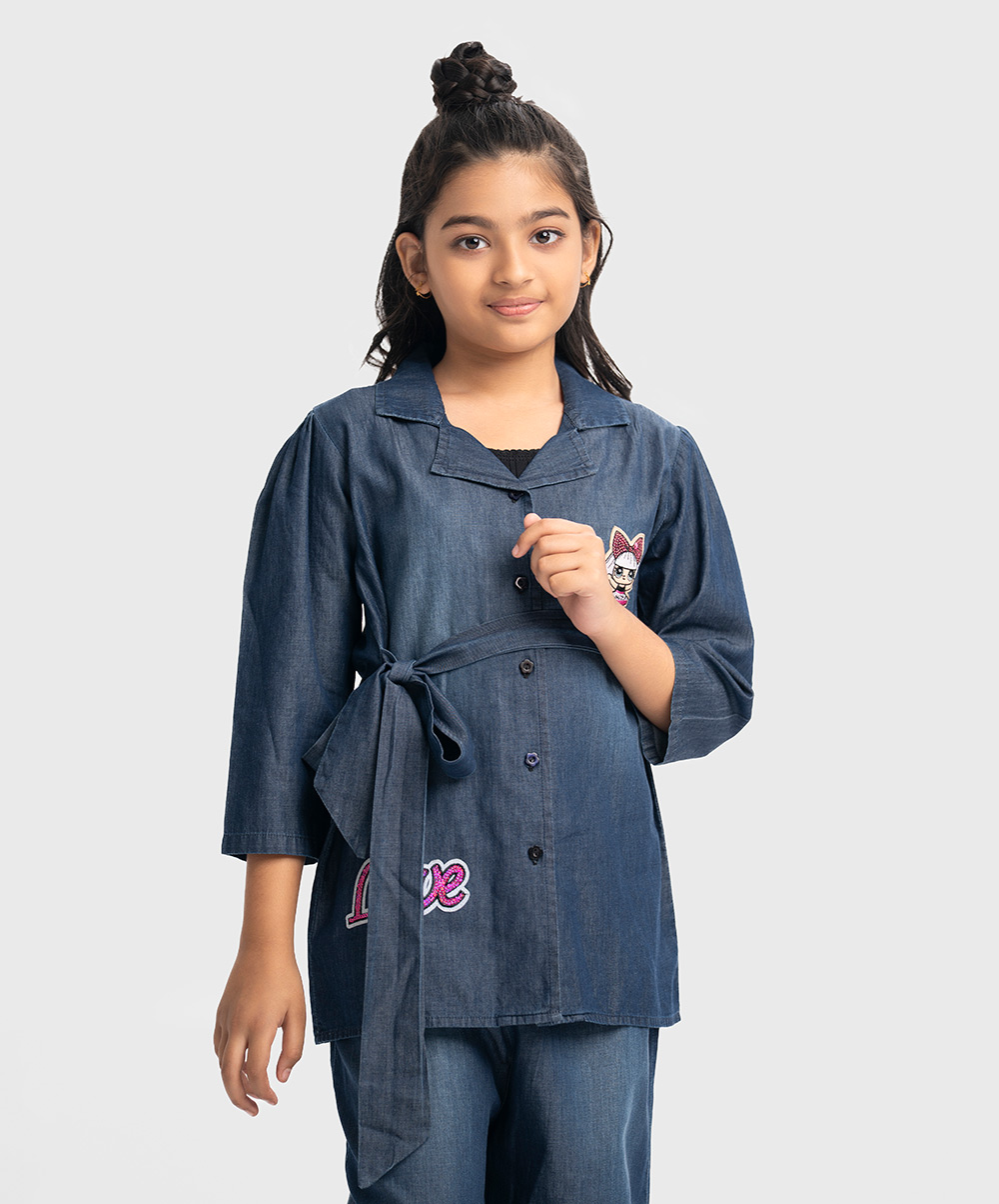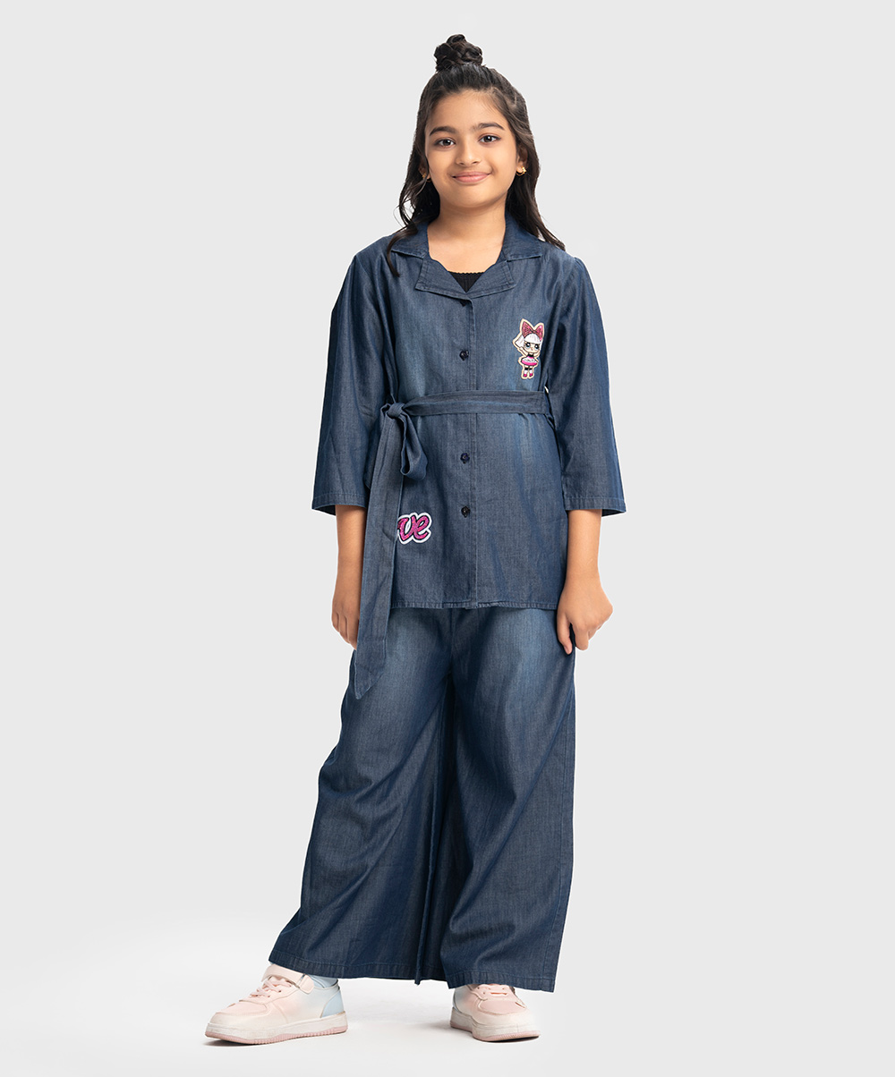 Kid girls woven set in blended cotton denim fabric. Three-quarter sleeves, lapel collar, waist tie-cord & embroidery patches at front of the top with palazzo pants.