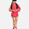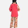 Round neck top in viscose fabric. Princess patterned with a front pocket and three-quarter sleeves. Long georgette pants with an elasticated waistline.