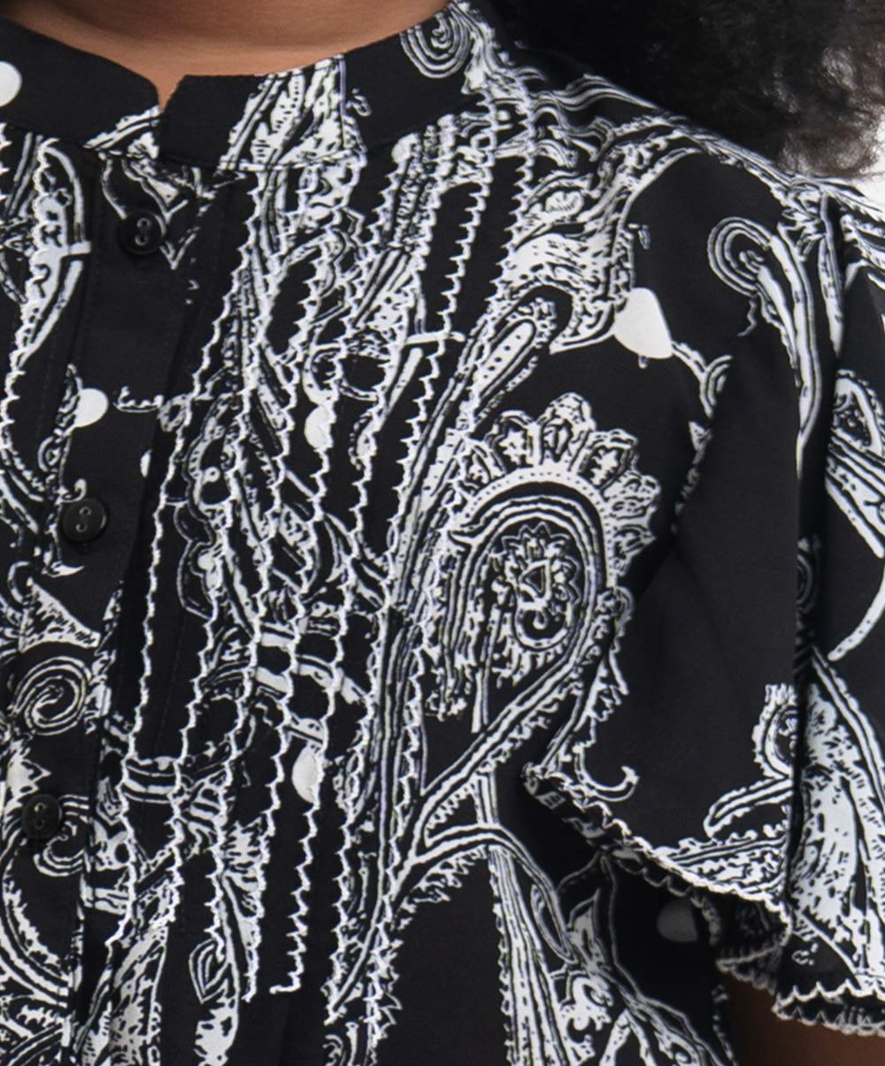 Band collar top with flounce sleeves in georgette fabric. Complemented with a asymetric frilled skirt.