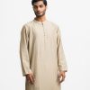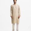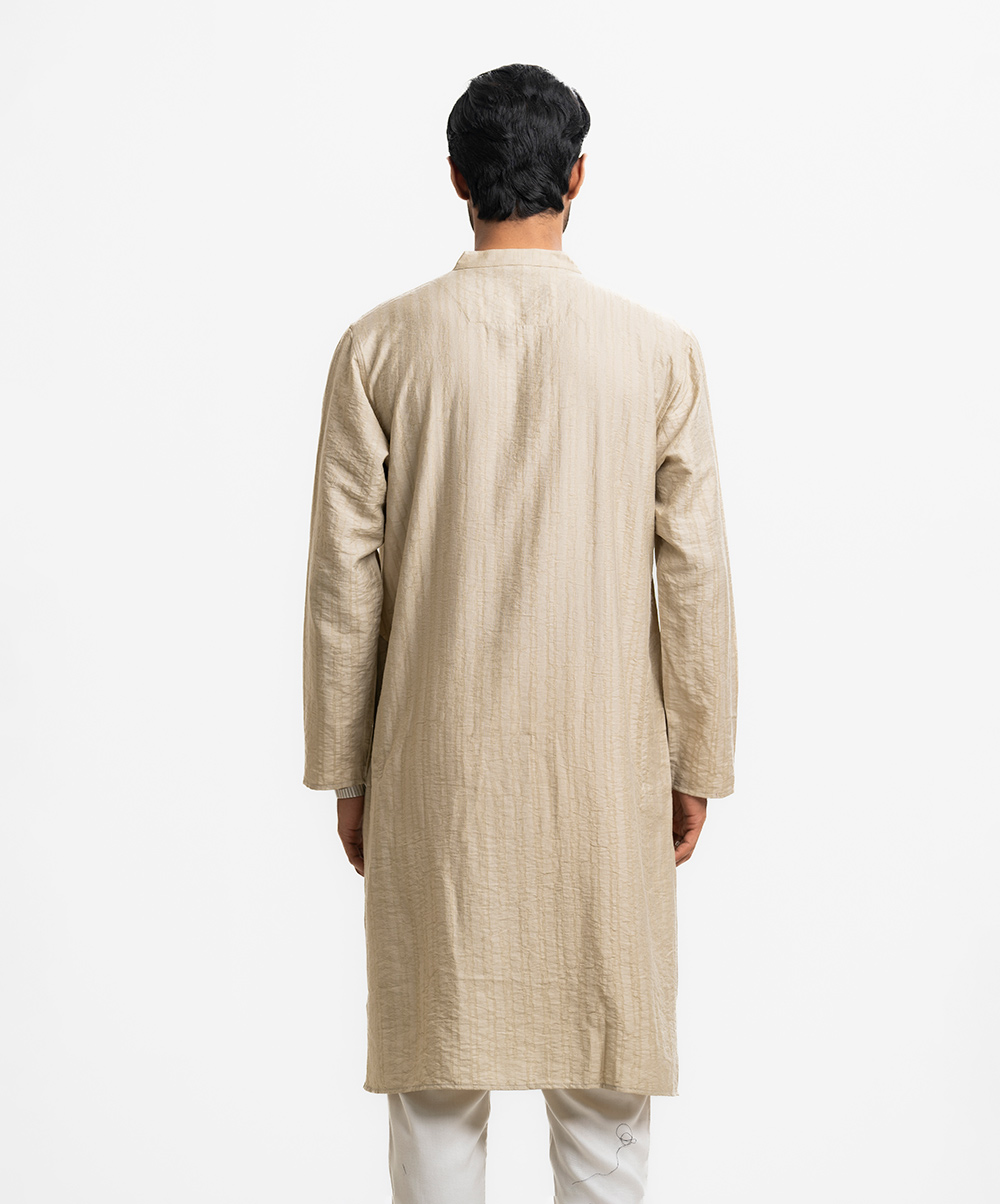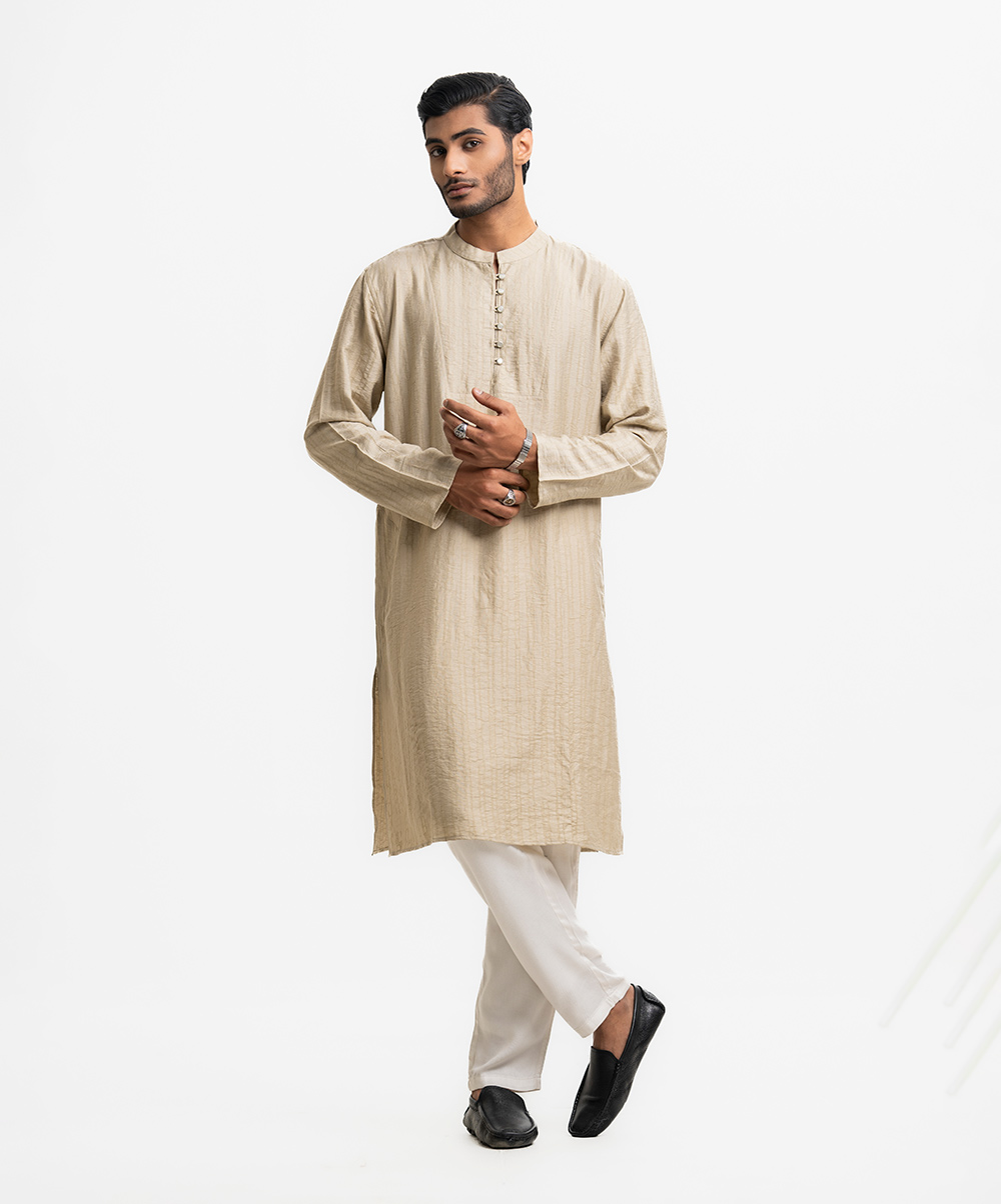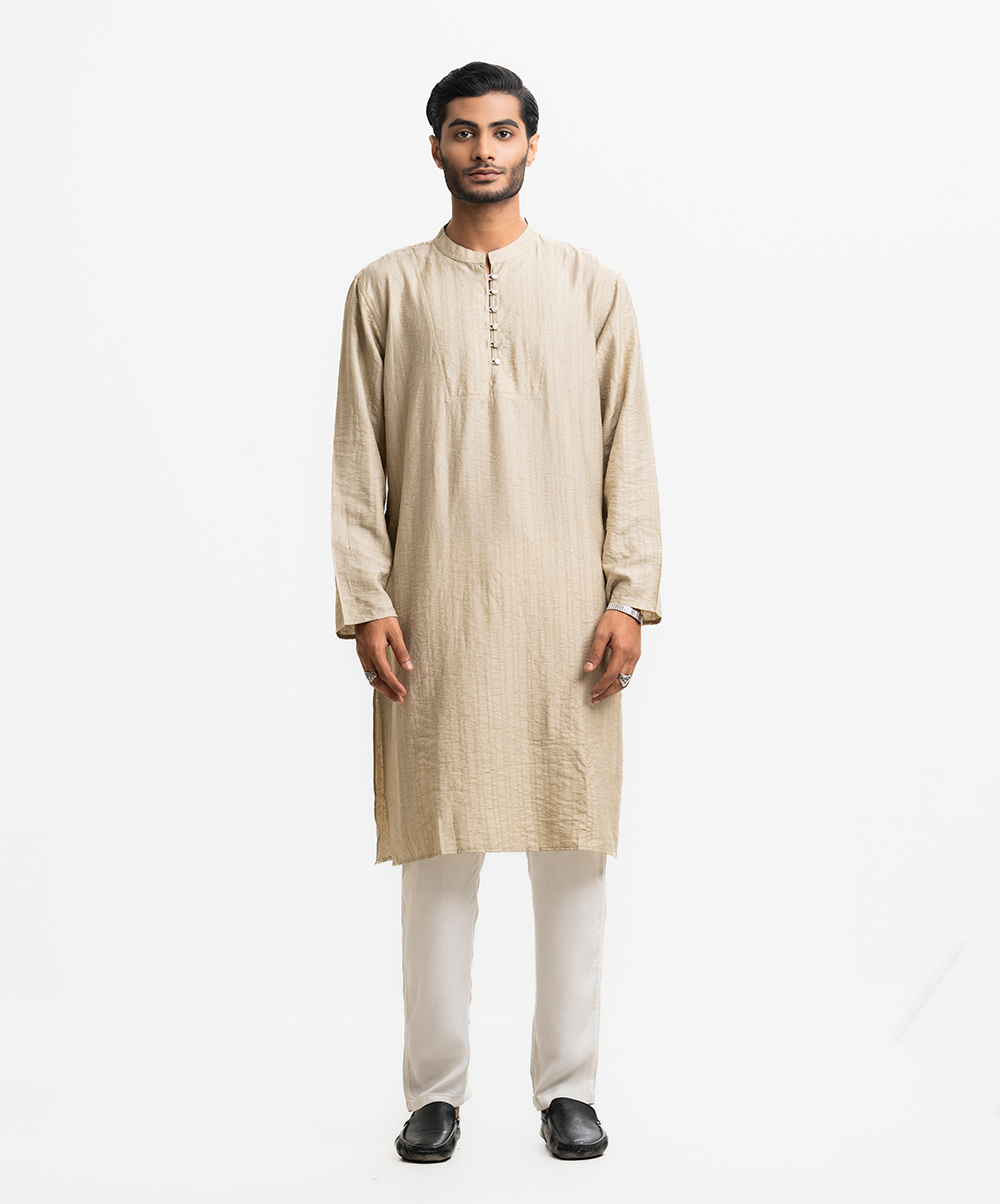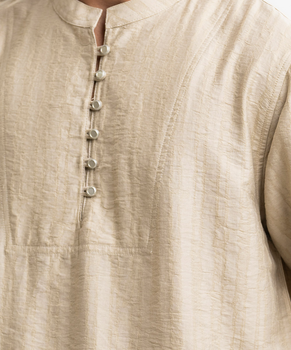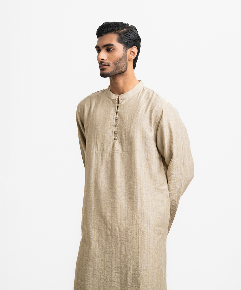 Men’s semi-fitted panjabi in nylon-blended fabric. Mandarin collar, traditional buttons placket. Full sleeves and inseam pockets.