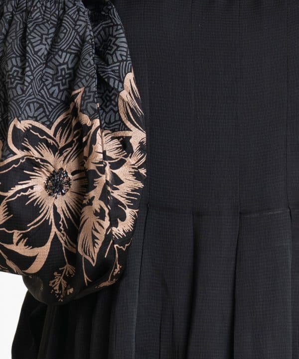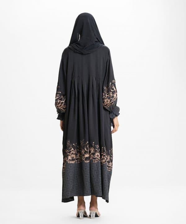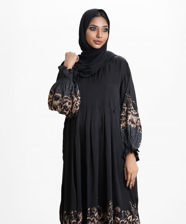 Women’s gown style abaya in crepe fabric. Round neck, bishop sleeves. Box pleated waistline. Karchupi and print detail at sleeves and hemline.