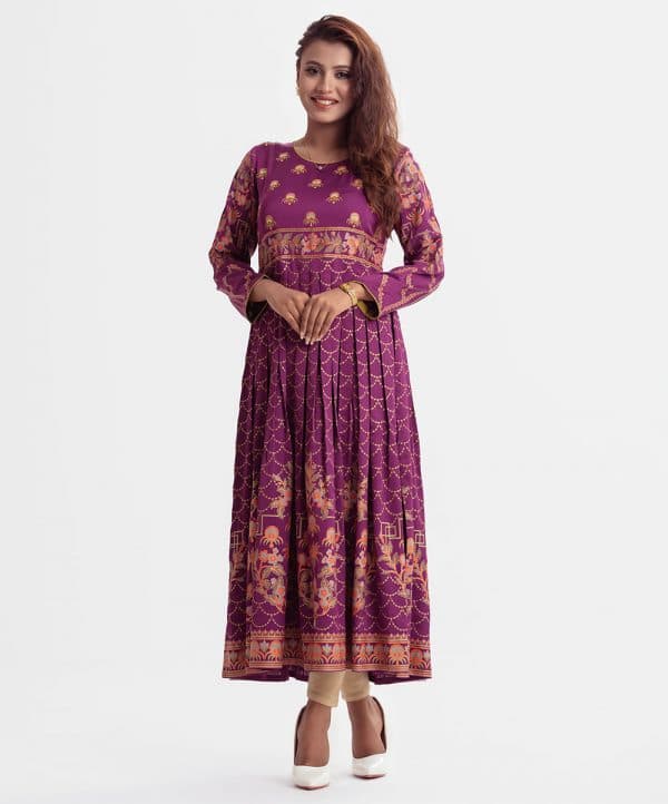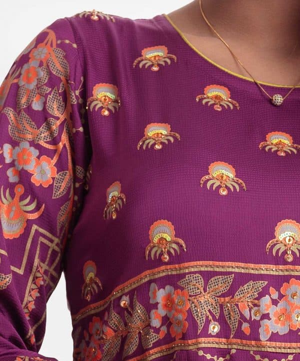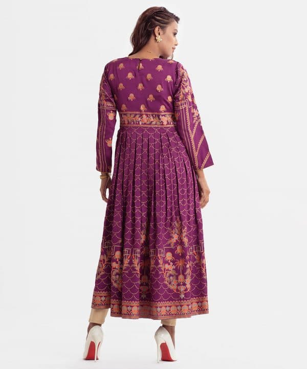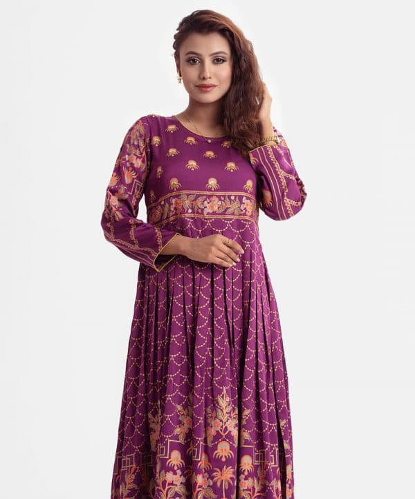 Printed A-line gown abaya in crepe fabric. Round neck, three-quarter sleeved. Karchupi at the front and box pleated at the waistline.