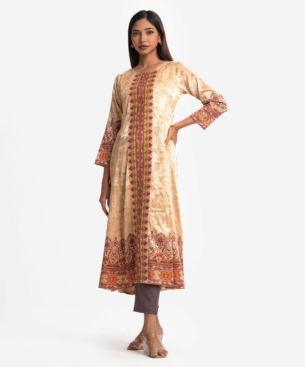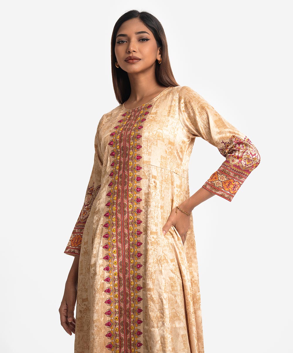 Round neck A-line abaya-style gown in soft satin georgette fabric. Full sleeves, embroidery at the front.
