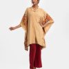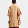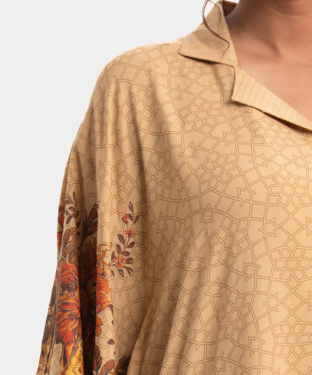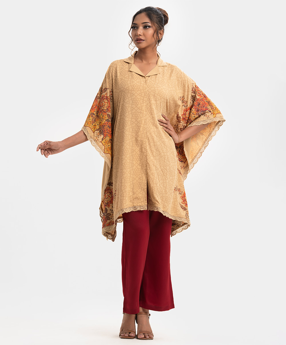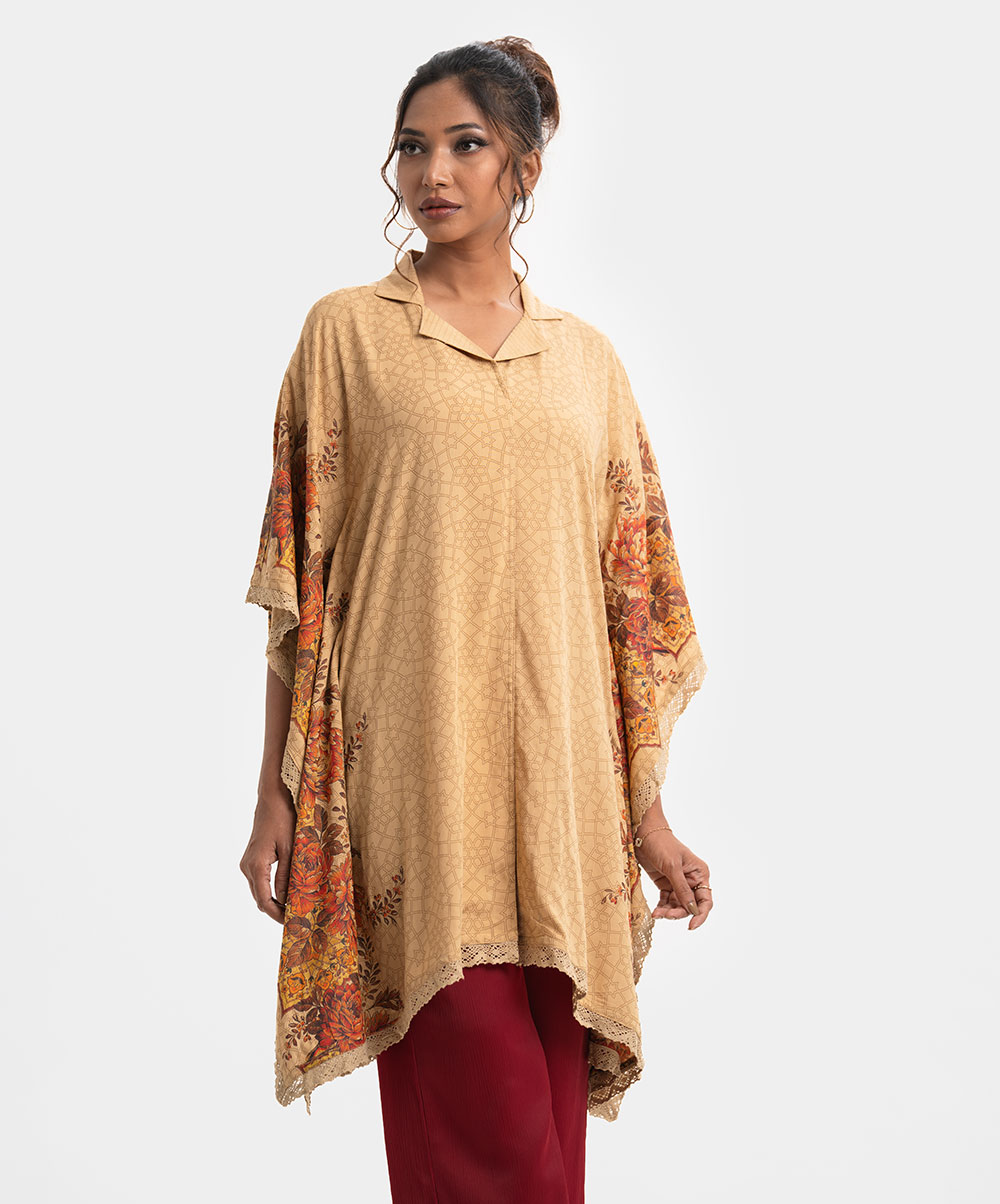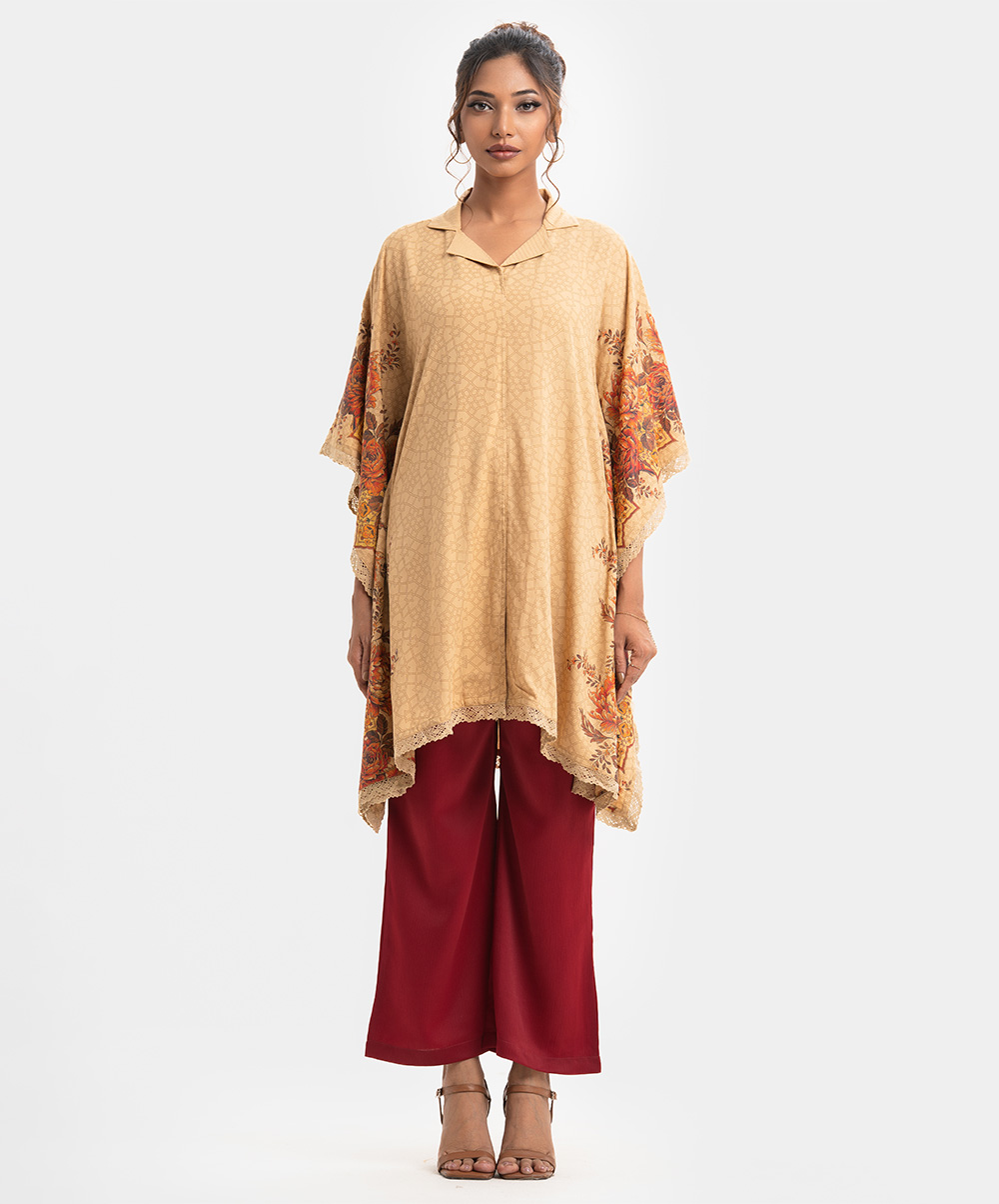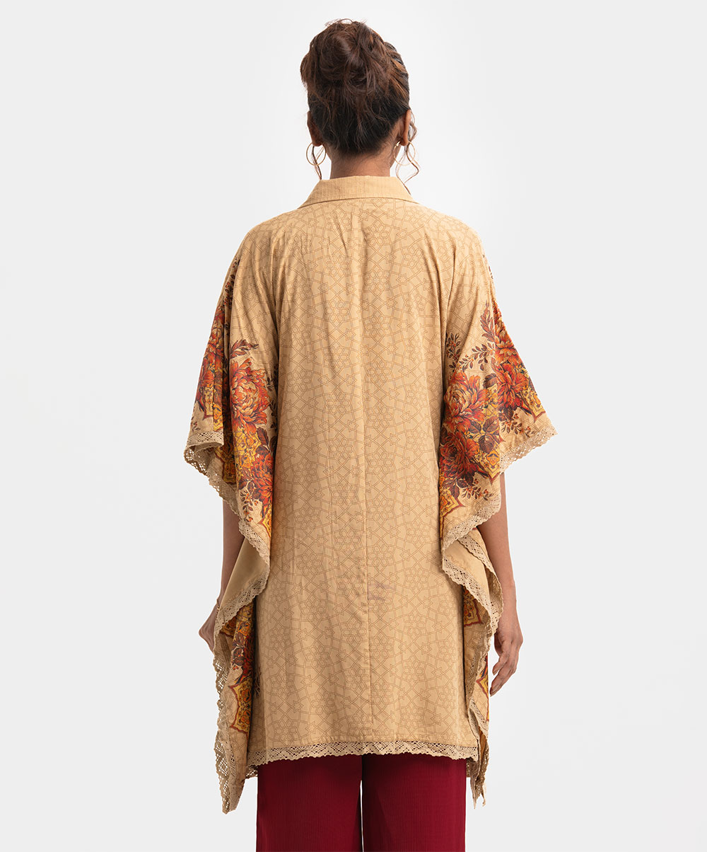 Women’s geometric lattice printed abaya-style kaftan in viscose fabric. Notched collar, lace attached at side borders.