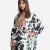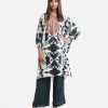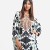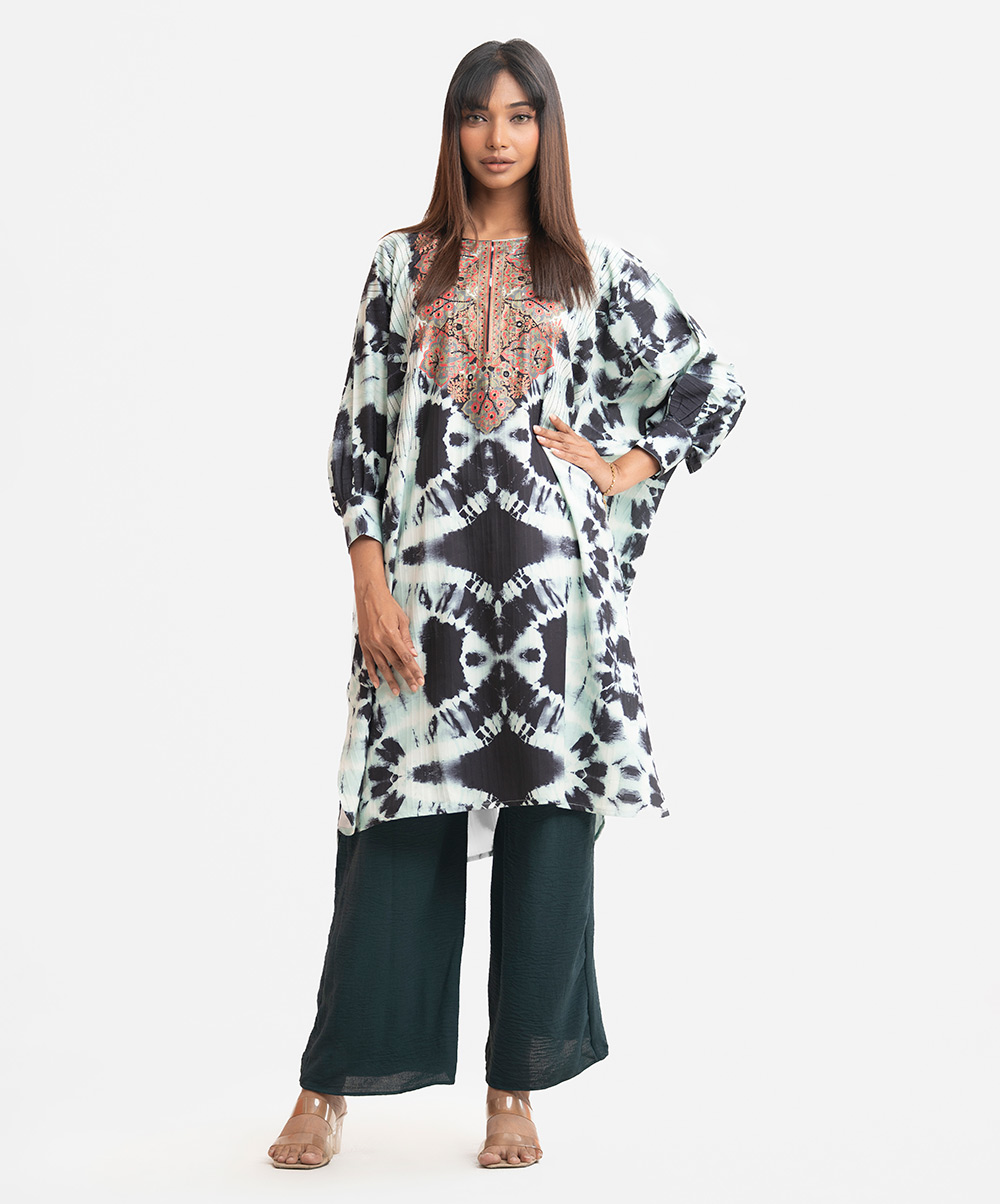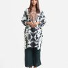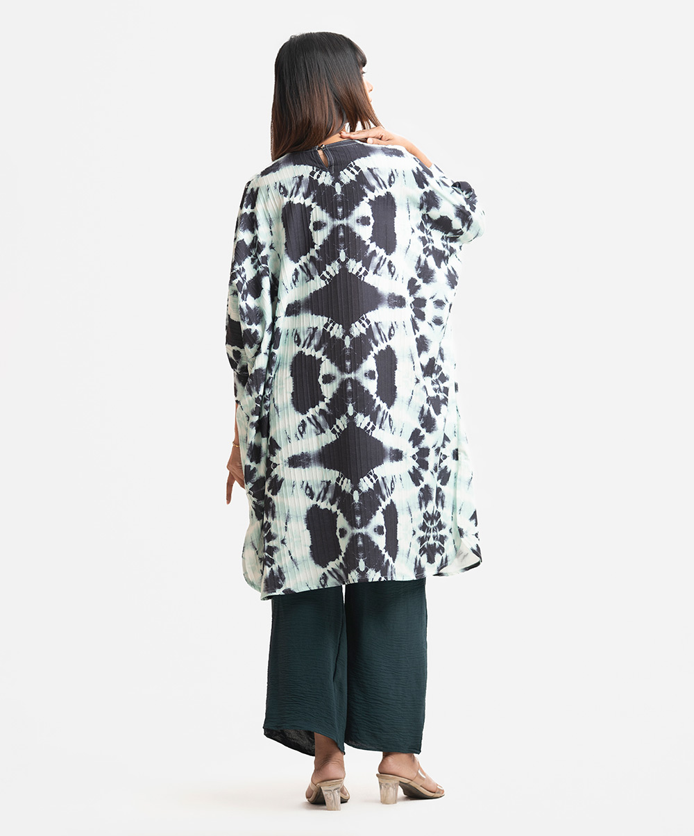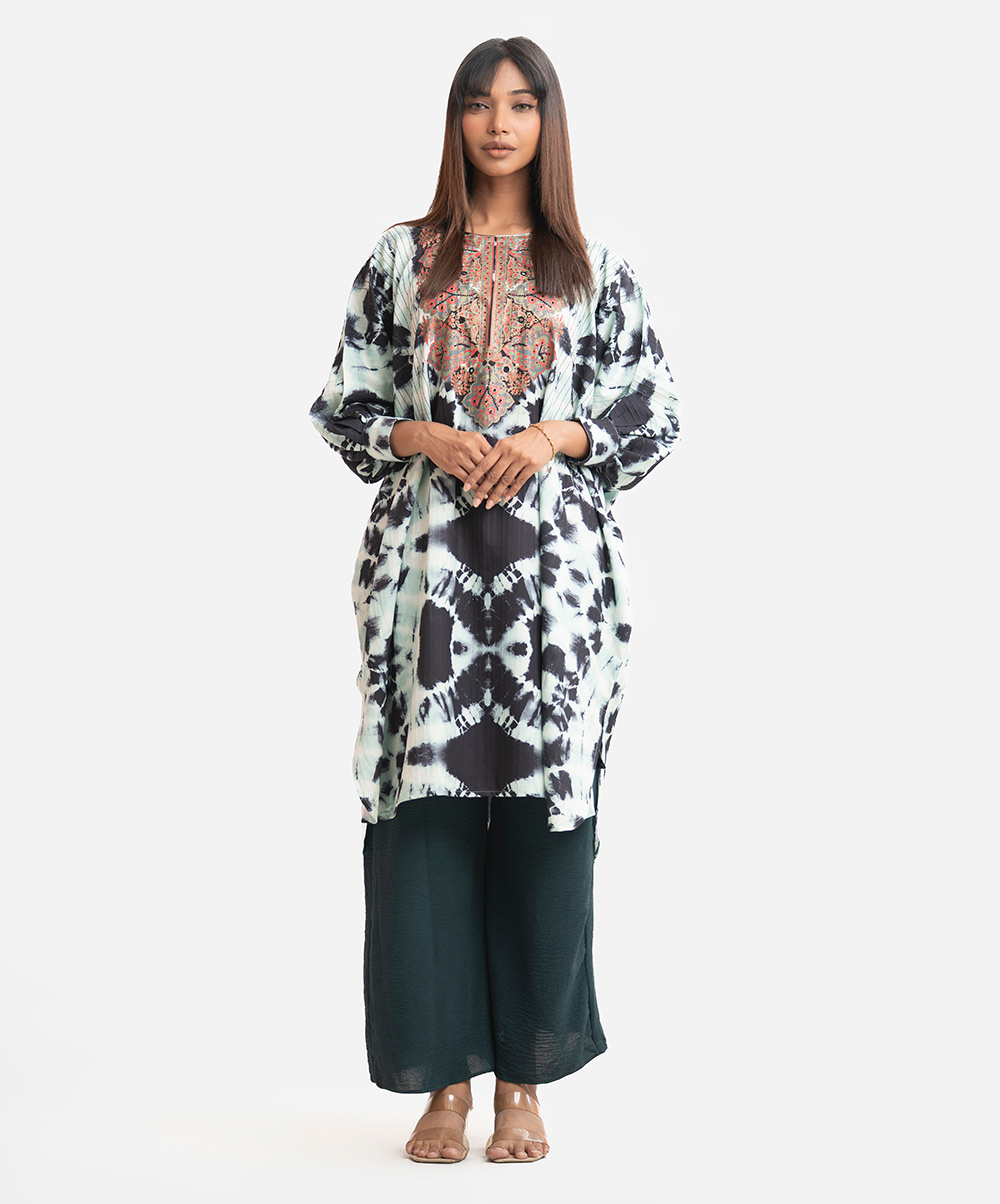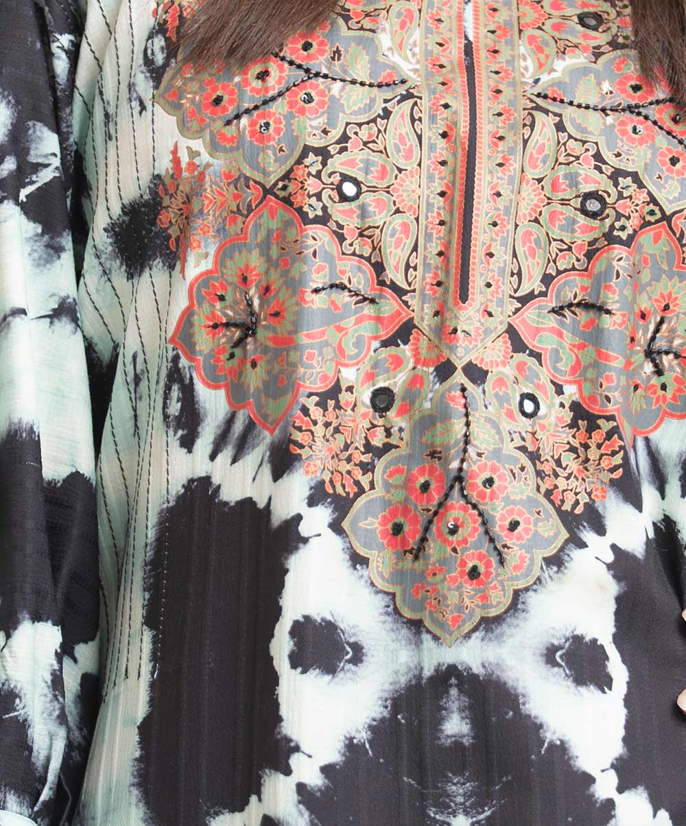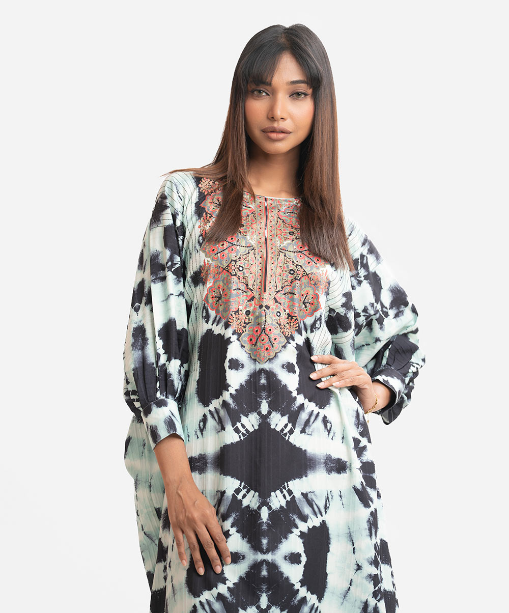 Women’s printed abaya-style kaftan in textured blended fabric. Round neck, button cuff sleeves and karchupi at front.