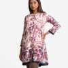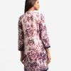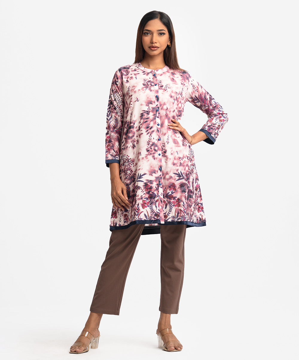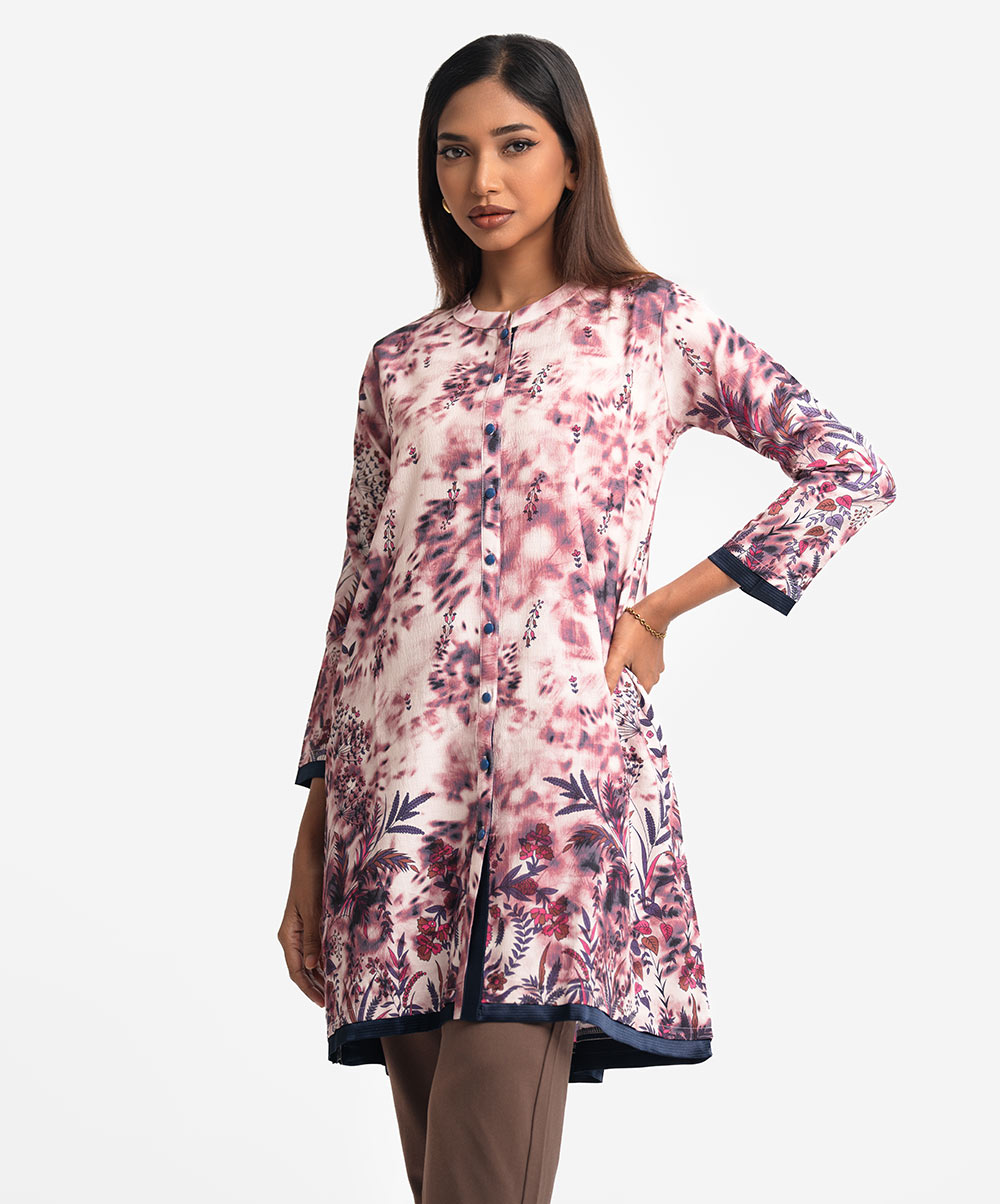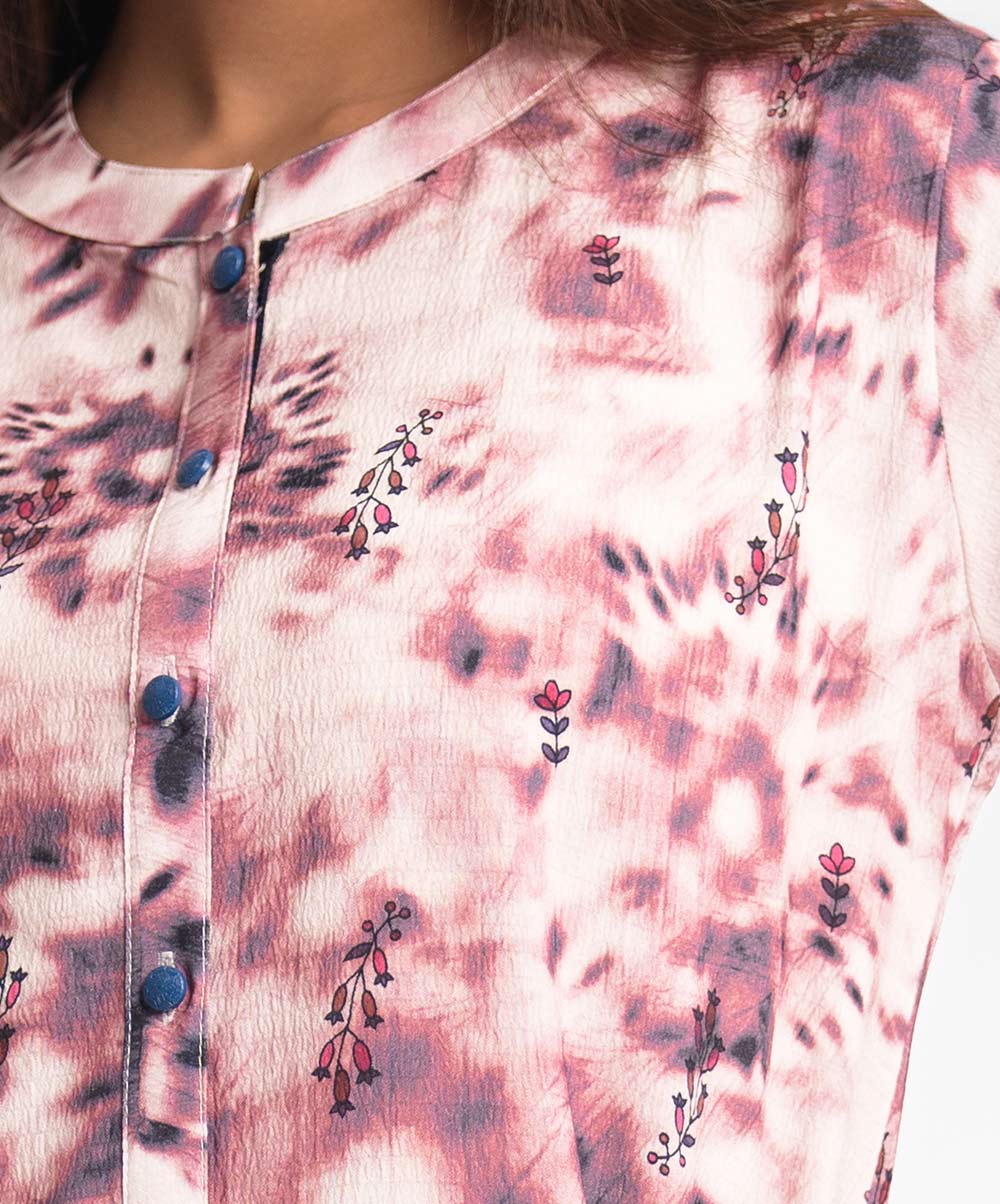Women’s printed A-line abaya-style shirt in blended fabric. Stand collar, full sleeves. Inseam pockets and buttons at front.