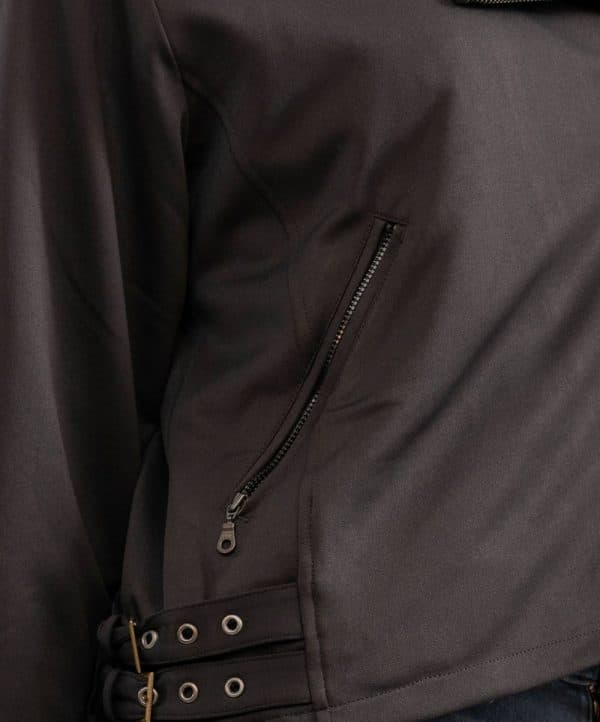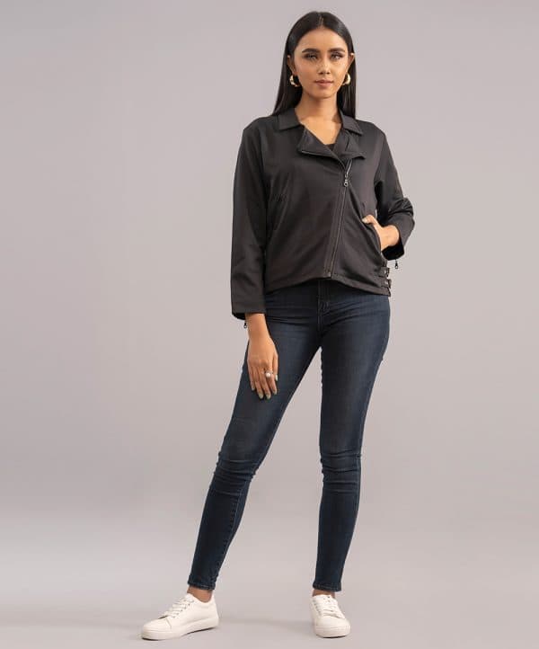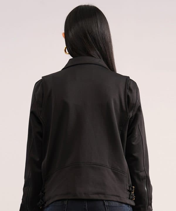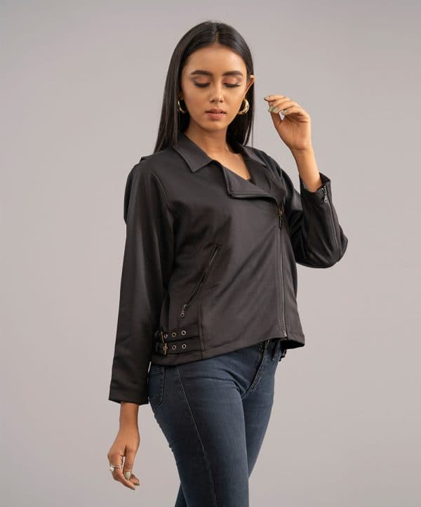 Black close-fitting Biker Jacket in Polyester fabric with zippers & pockets. Inner in Taffeta fabric.