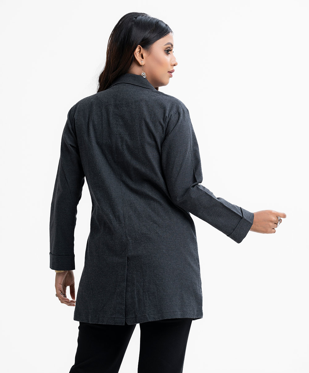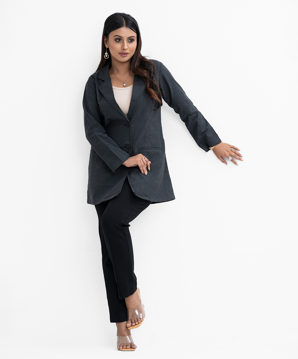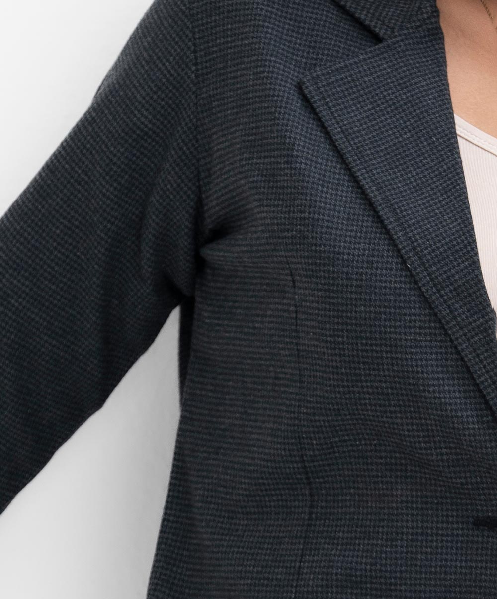 Women’s houndstooth blazer in cotton flannel fabric. Full-sleeved, lapel collar. Two front pockets.