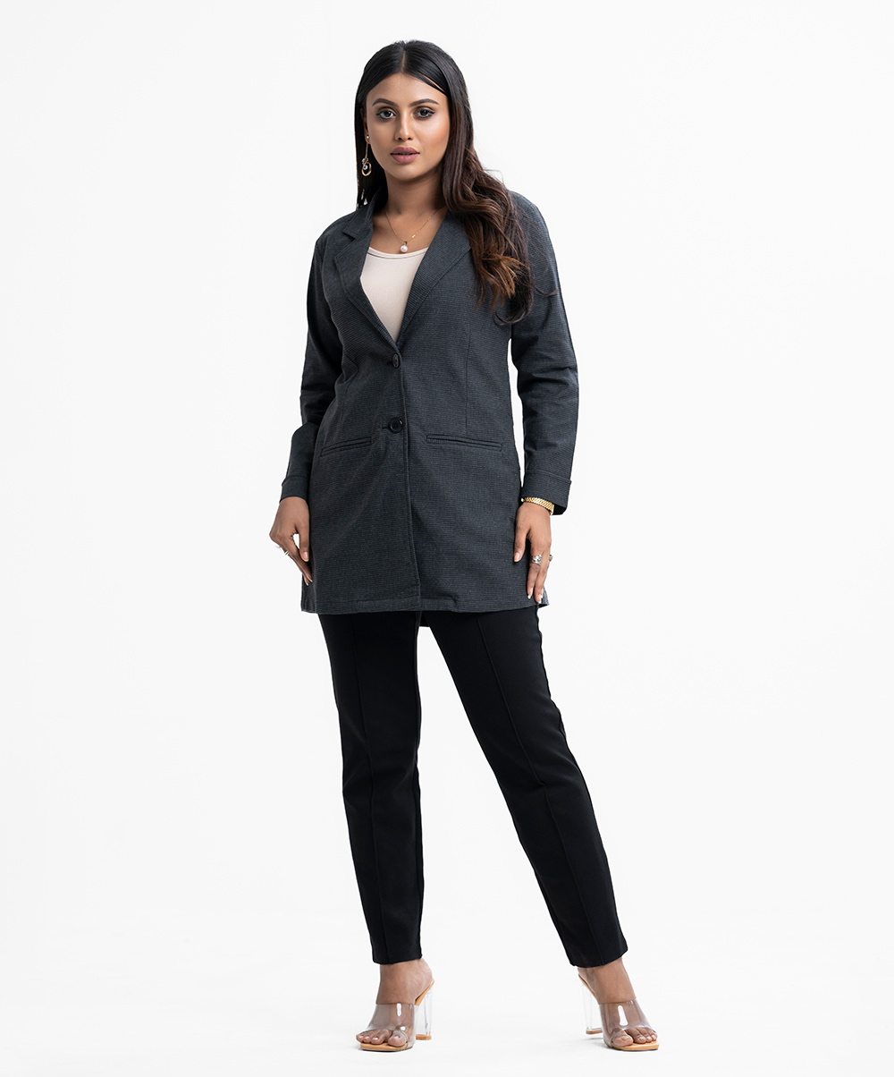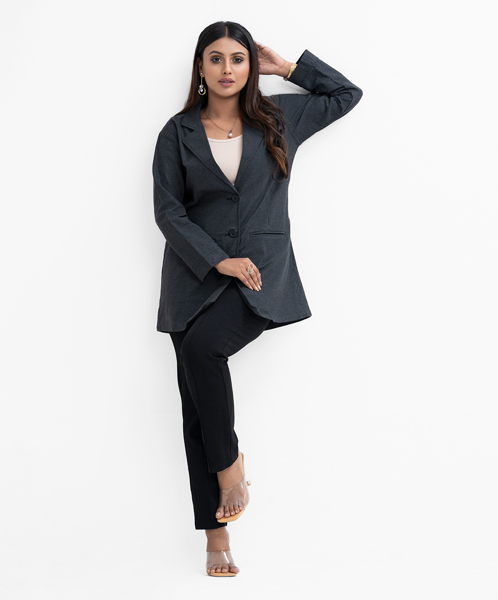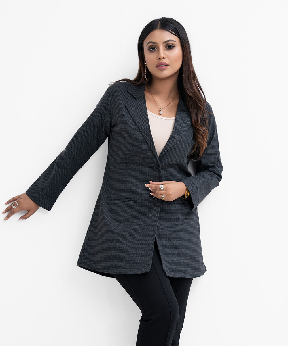 Women’s houndstooth blazer in cotton flannel fabric. Full-sleeved, lapel collar. Two front pockets.