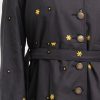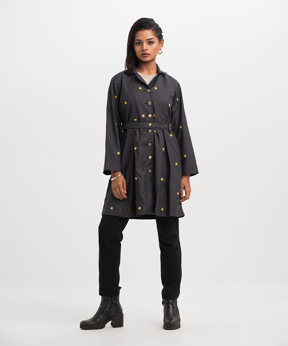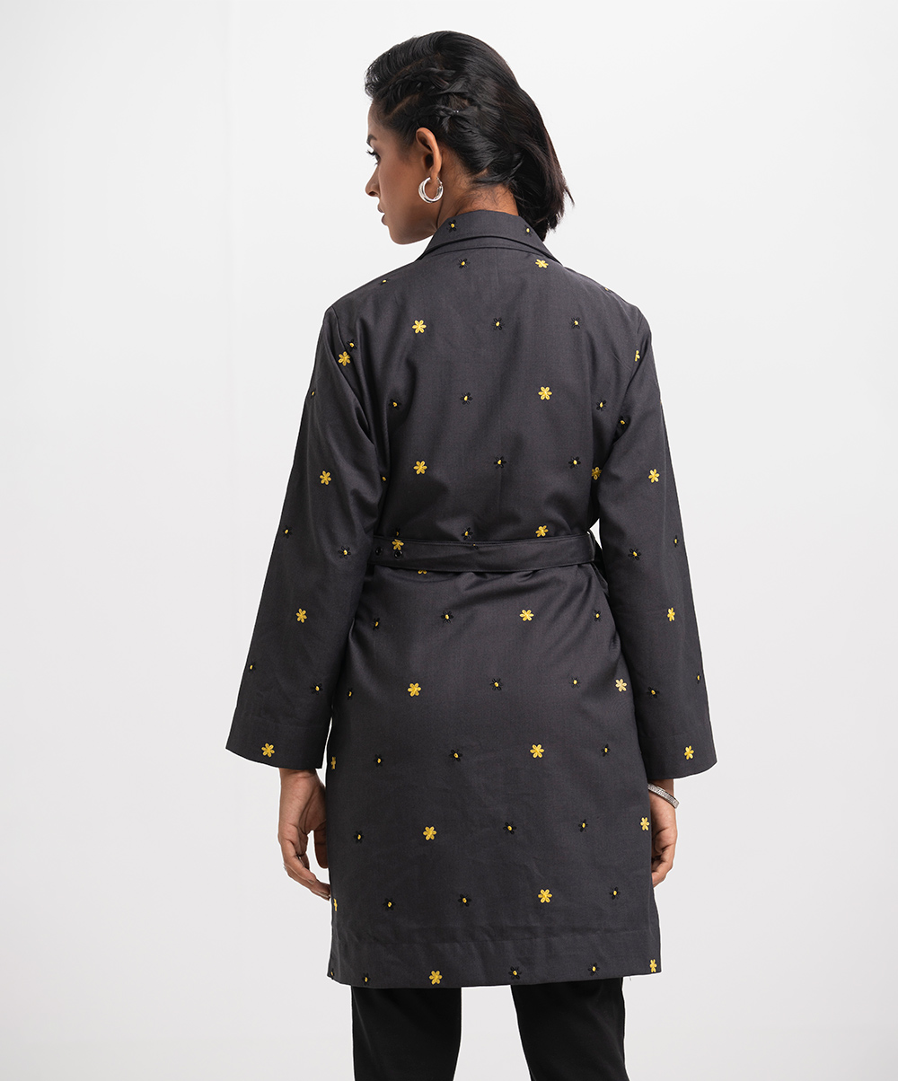 Princess-patterned single-breasted jacket in rayon-blended fabric. Lapel collar, adjustable waist belt with inseam patch pockets.