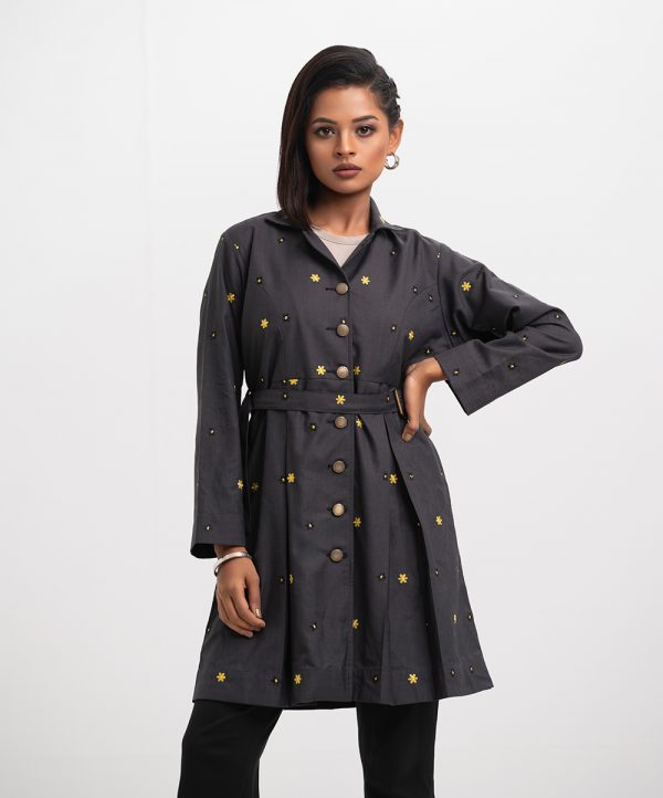 Princess-patterned single-breasted jacket in rayon-blended fabric. Lapel collar, adjustable waist belt with inseam patch pockets.