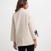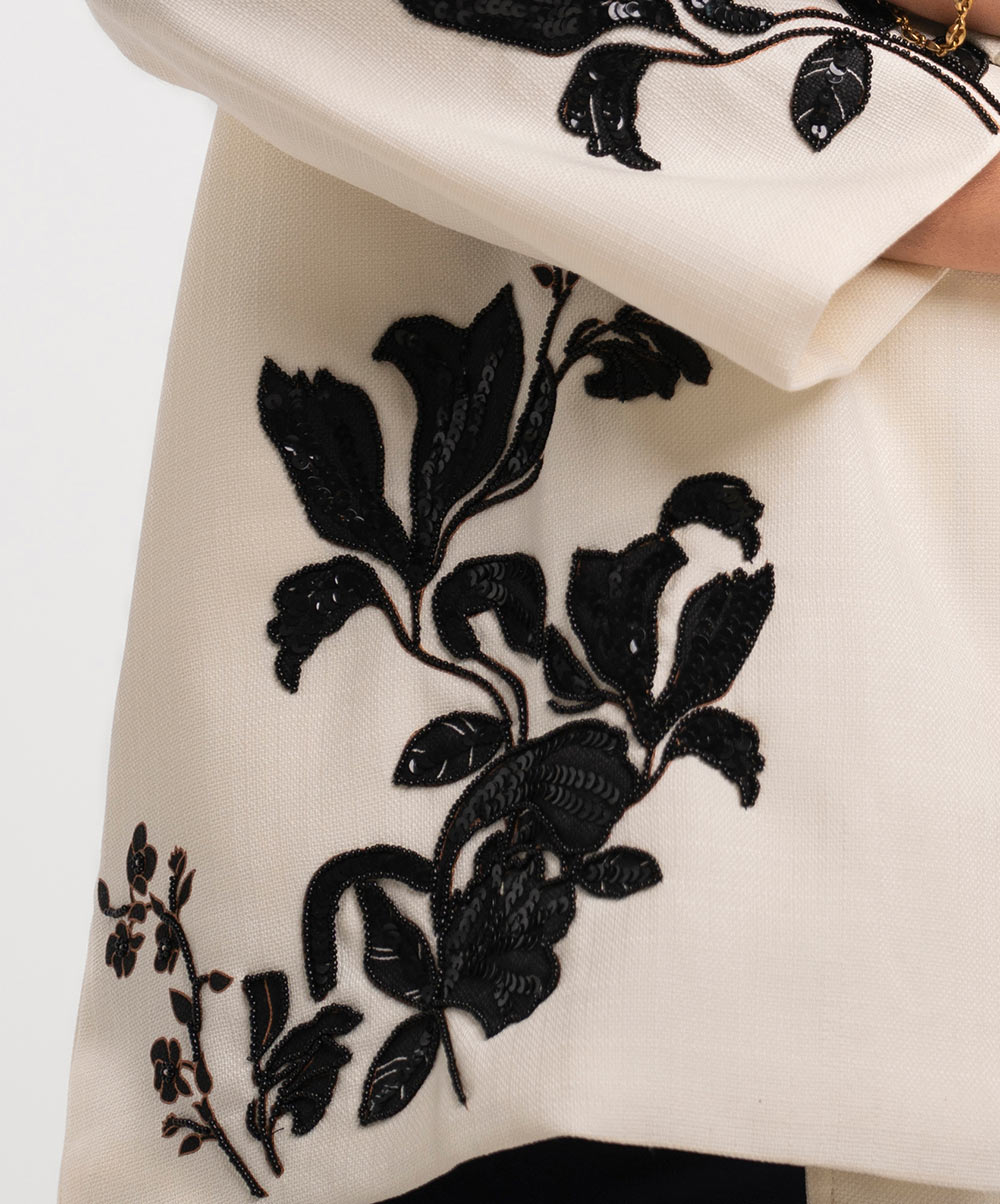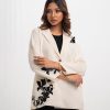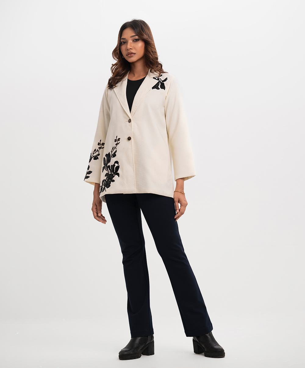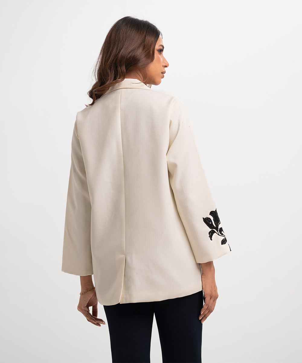 Lapel collar single-breasted blazer in stretchable blended fabric. Inseam side pockets. Karchupi at the front and sleeves. Exclusive edit from the Nargisus by Le Reve.