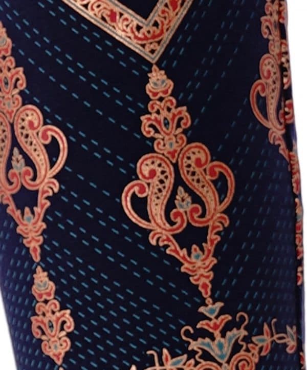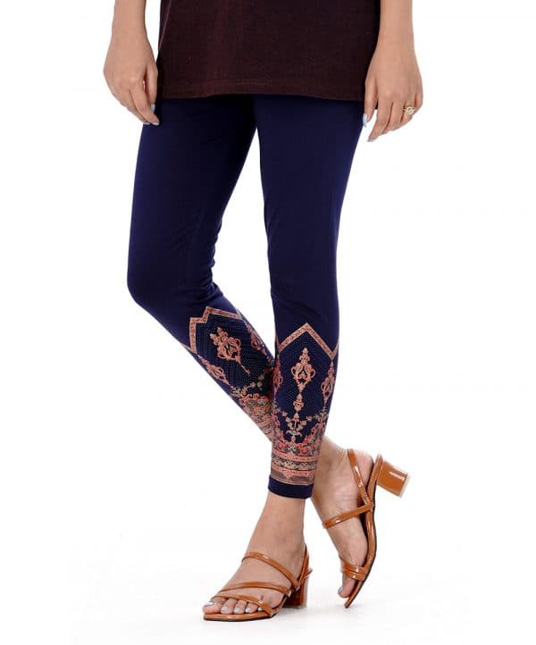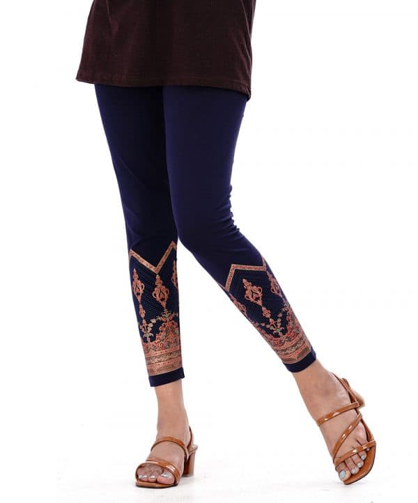 Blue legging in stretchable cotton knit fabric with prints on the border. Concealed elastication on the waistline.