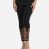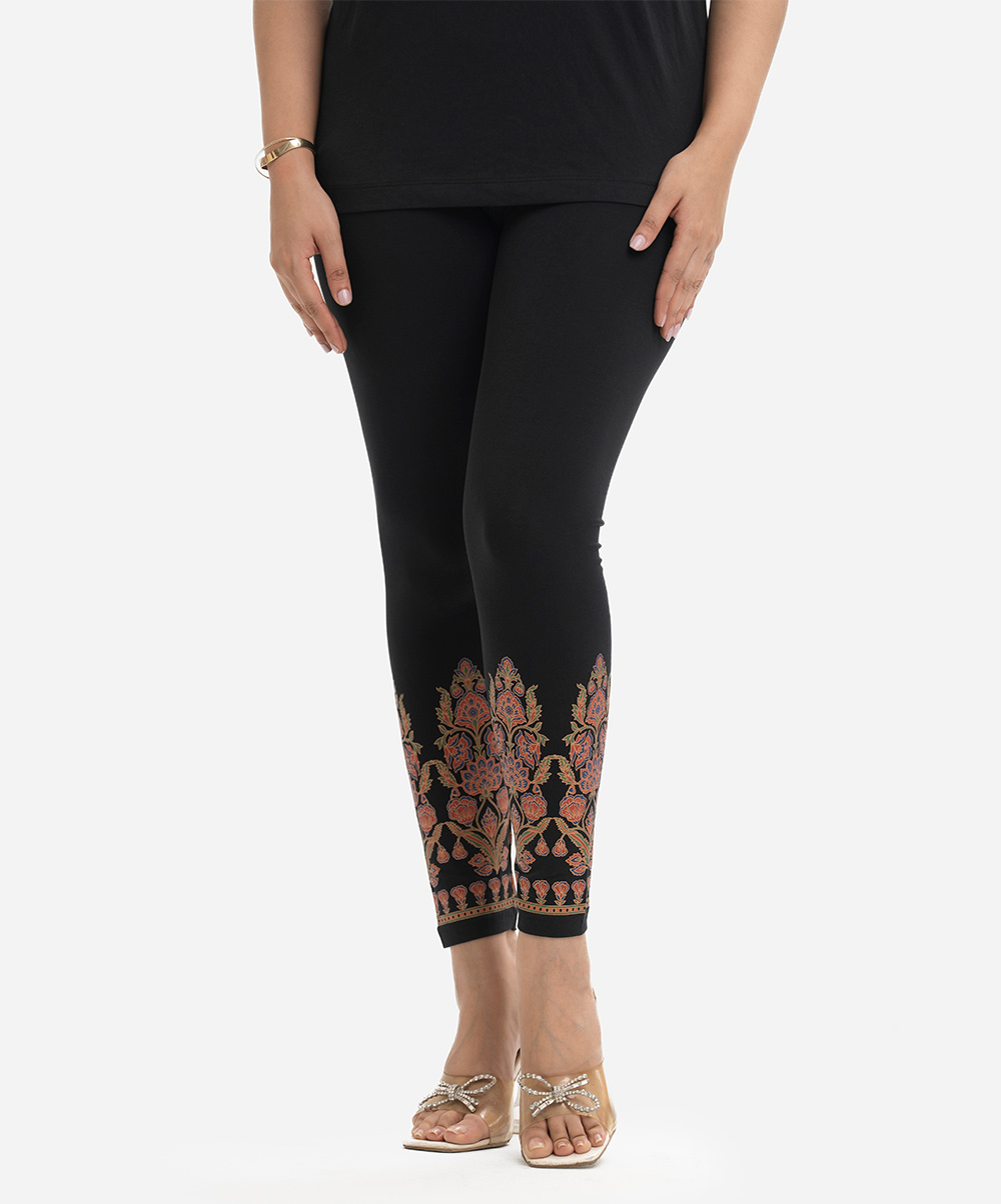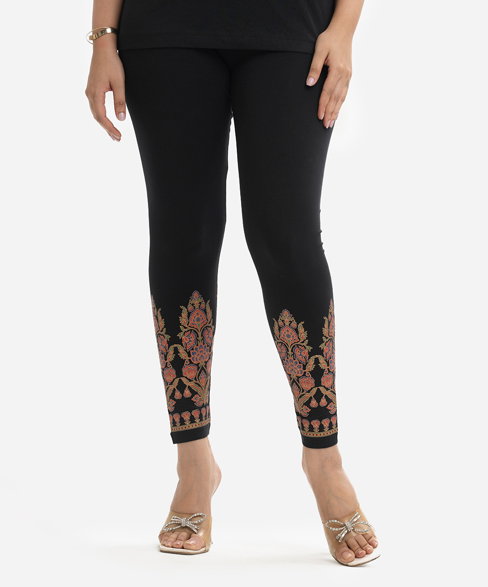 Women’s leggings in stretchable cotton knit fabric. Concealed elasticated waistline and print detail at cuff.