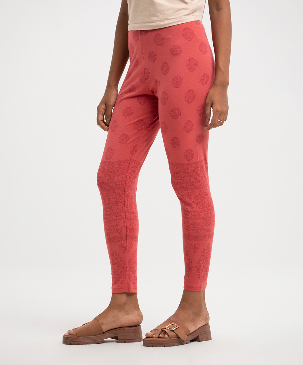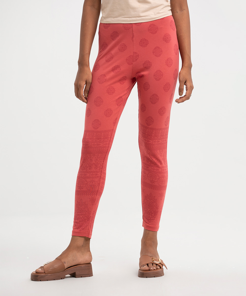 Women’s leggings in stretchable cotton knit fabric. Concealed elasticated waistline and all-over printed.
