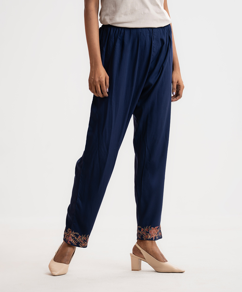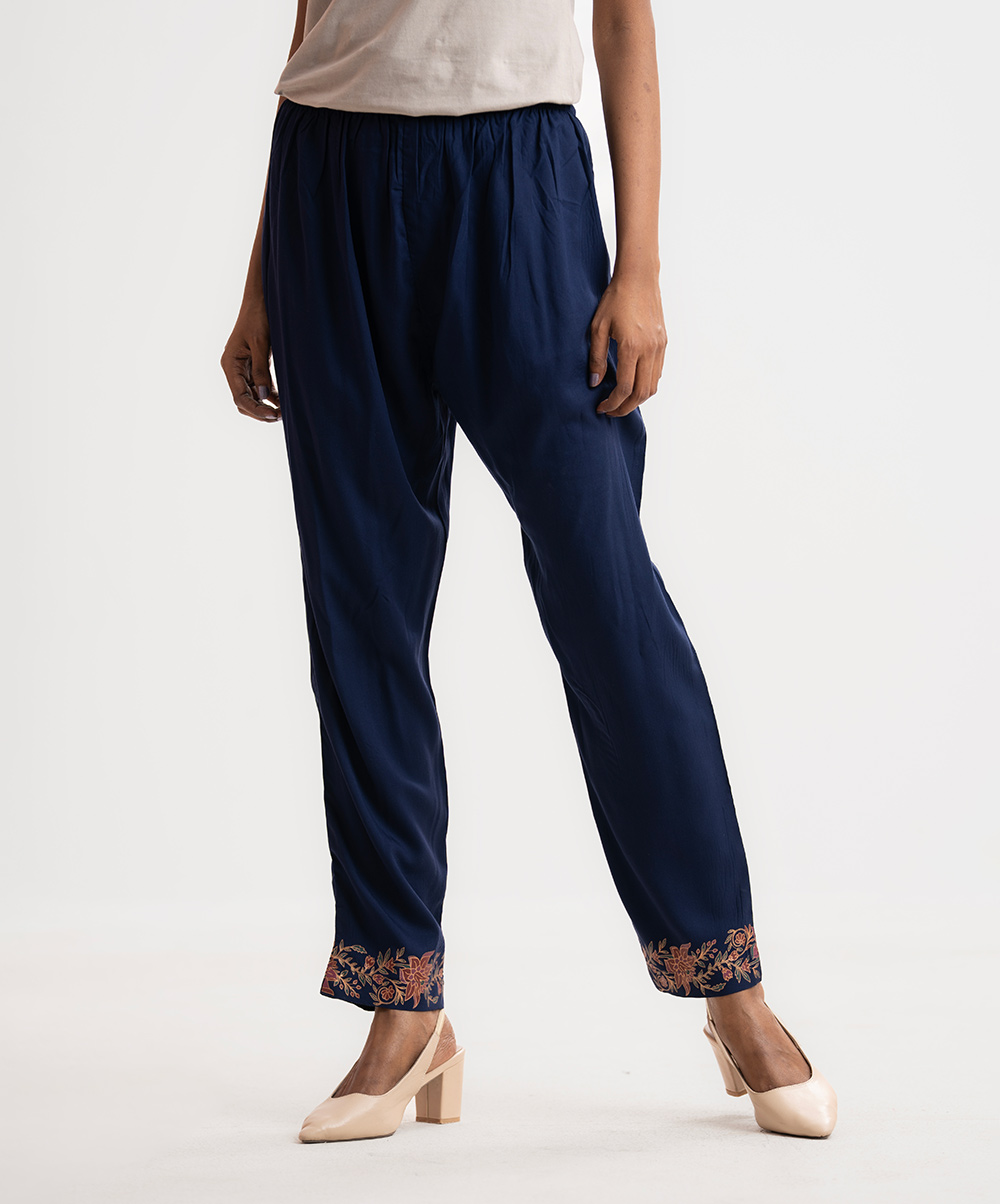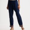 Women’s pant pajamas in viscose fabric. Concealed elasticated waistline and print at leg hemline.