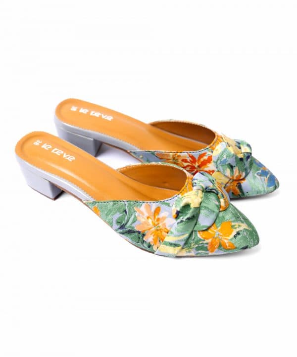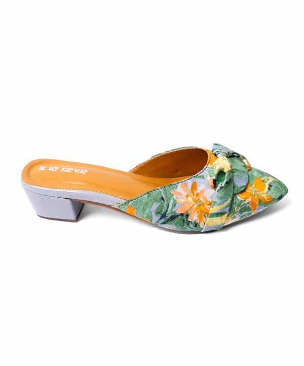 Green slide sandals with mid block heels. Comfortable cushioning at inner soles. Detailed with a fabricated closed-toe vamp with a ribbon on the top.