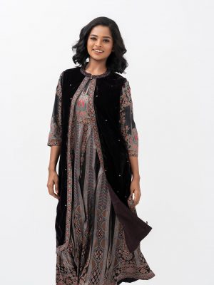 Women’s printed A-line gown in viscose fabric. Round neck, long sleeves.