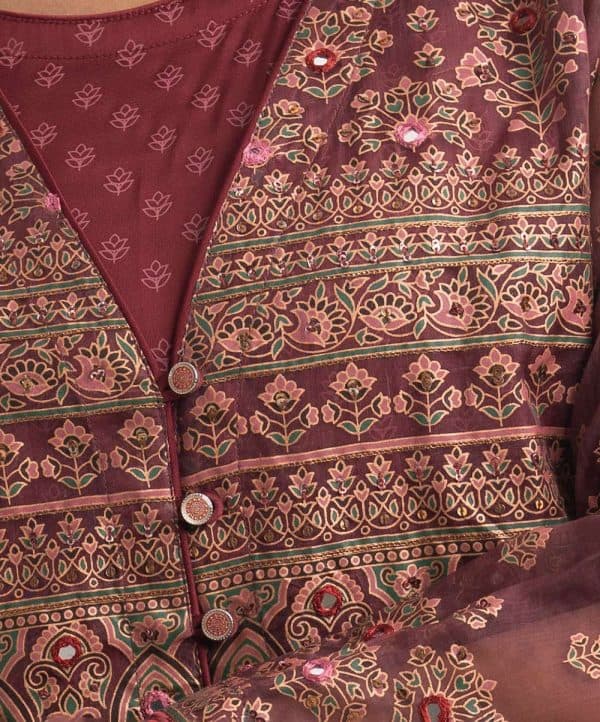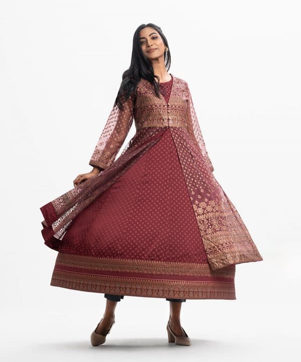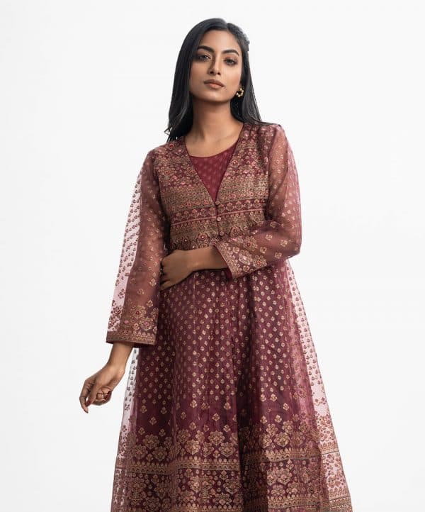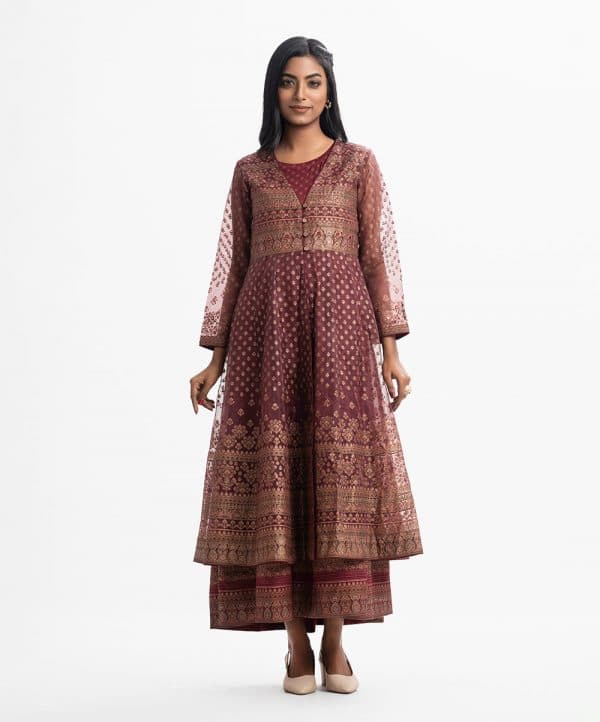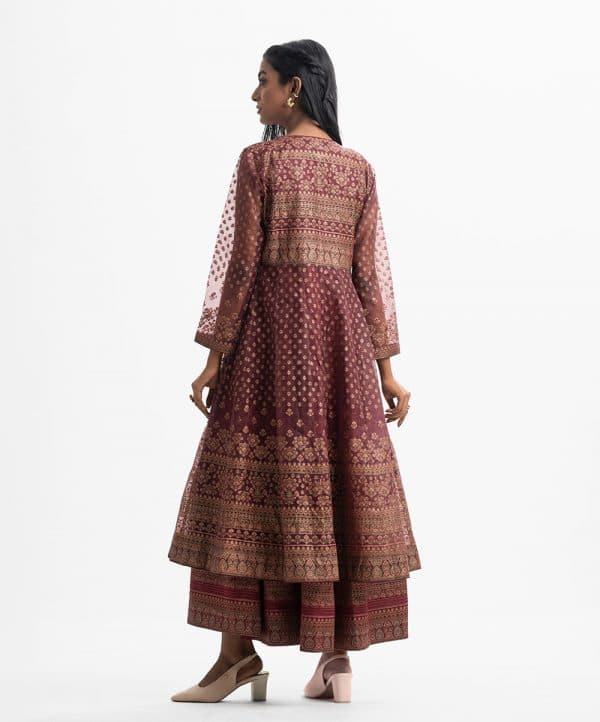 Long patterned shrug and tunic from Nargisus by Le Reve. The long-sleeve muslin shrug contains detailed karchupi at the front and cuffs. Complemented with a flared, sleeveless satin-georgette tunic.